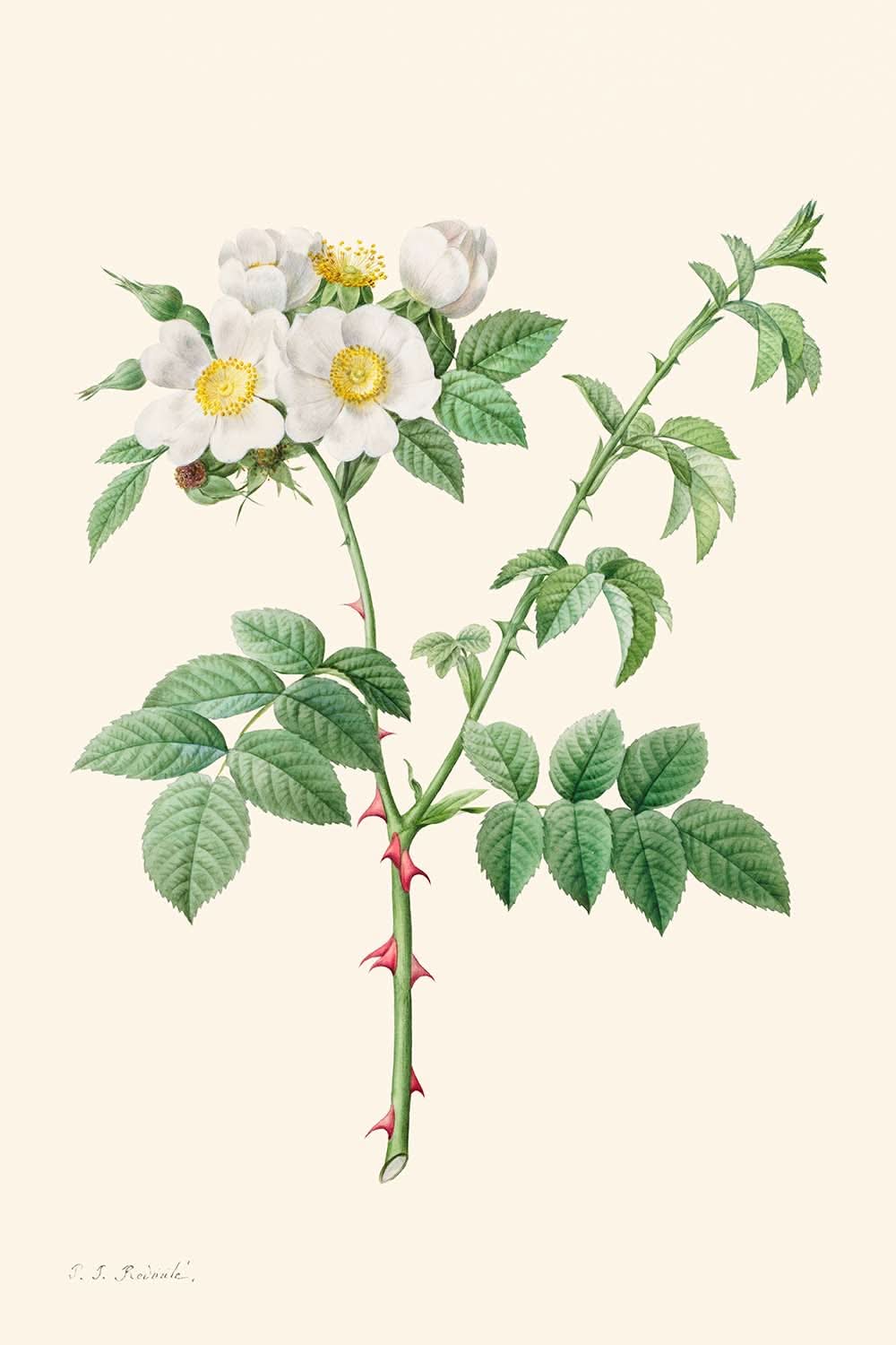 Brier Bush Rose oder Dog Rose, erstmals 1817 veröffentlicht, ist eine atemberaubende botanische Illustration des berühmten Künstlers Pierre-Joseph Redouté. Redouté, bekannt als einer der größten botanischen Illustratoren der Geschichte, widmete einen Großteil seiner Karriere der akribischen Darstellung der Flora des Château de Malmaison unter der Schirmherrschaft von Josephine Bonaparte, der geschätzten Frau Napoleons.