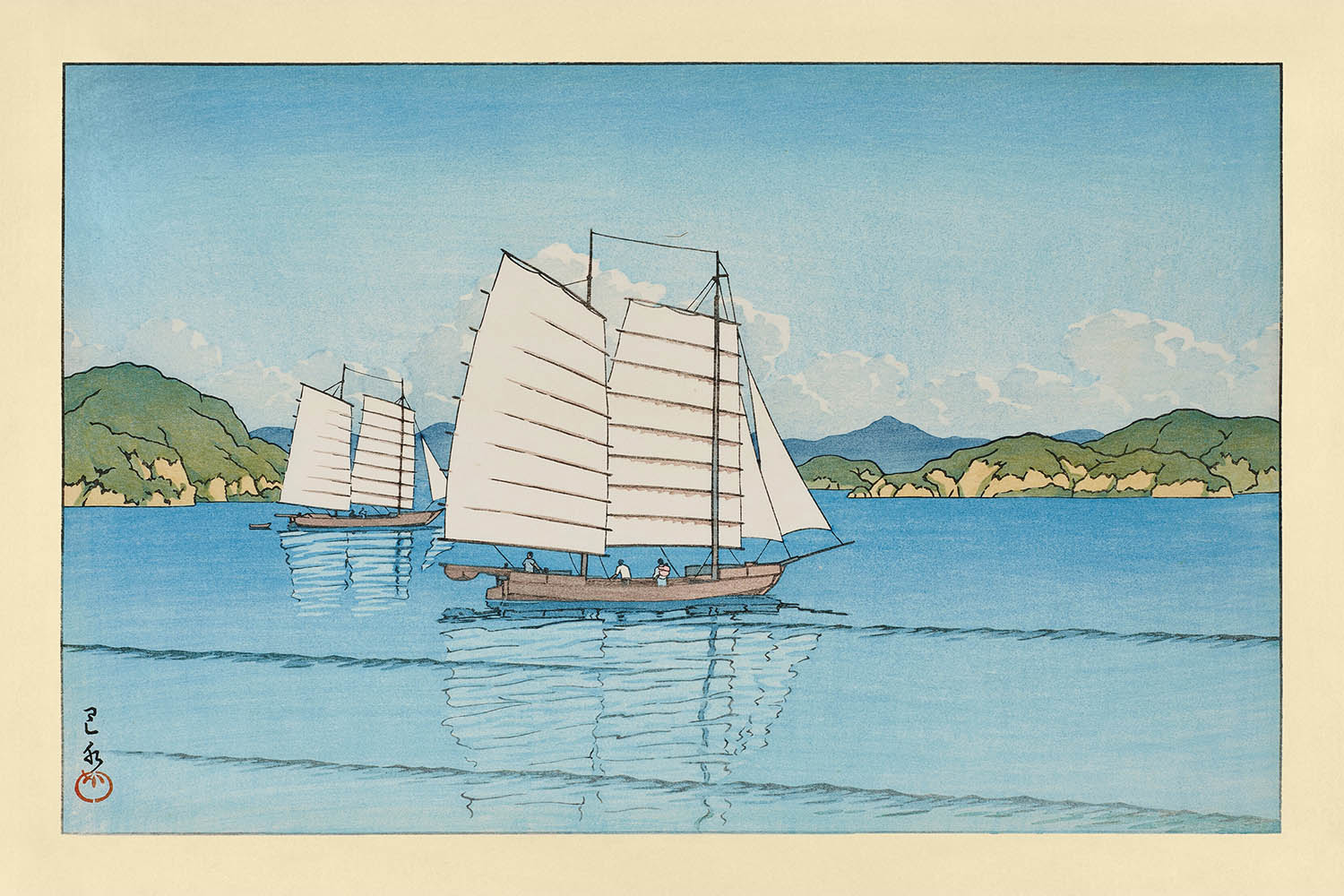 Hasui Kawase, ein renommierter japanischer Holzschnittkünstler, erweckt die ruhige Schönheit von Japans "Inland Sea" in diesem exquisiten Werk, das ursprünglich 1952 geschaffen wurde, zum Leben. Kawase, bekannt für seine lebendigen und atmosphärischen Landschaften, ist eine zentrale Figur der Shin Hanga-Bewegung, die darauf abzielte, traditionelle japanische Drucktechniken mit einem modernen Gefühl zu revitalisieren. Seine Werke fangen oft flüchtige Momente der Schönheit ein, die in der Natur zu finden sind, tief verbunden mit den wechselnden Jahreszeiten und dem zarten Gleichgewicht von Land und Meer.
