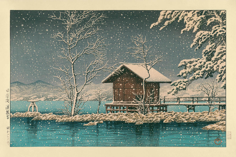 Kansagu-Schrein am Lake Tawaza im Schnee von Hasui Kawase, 1935