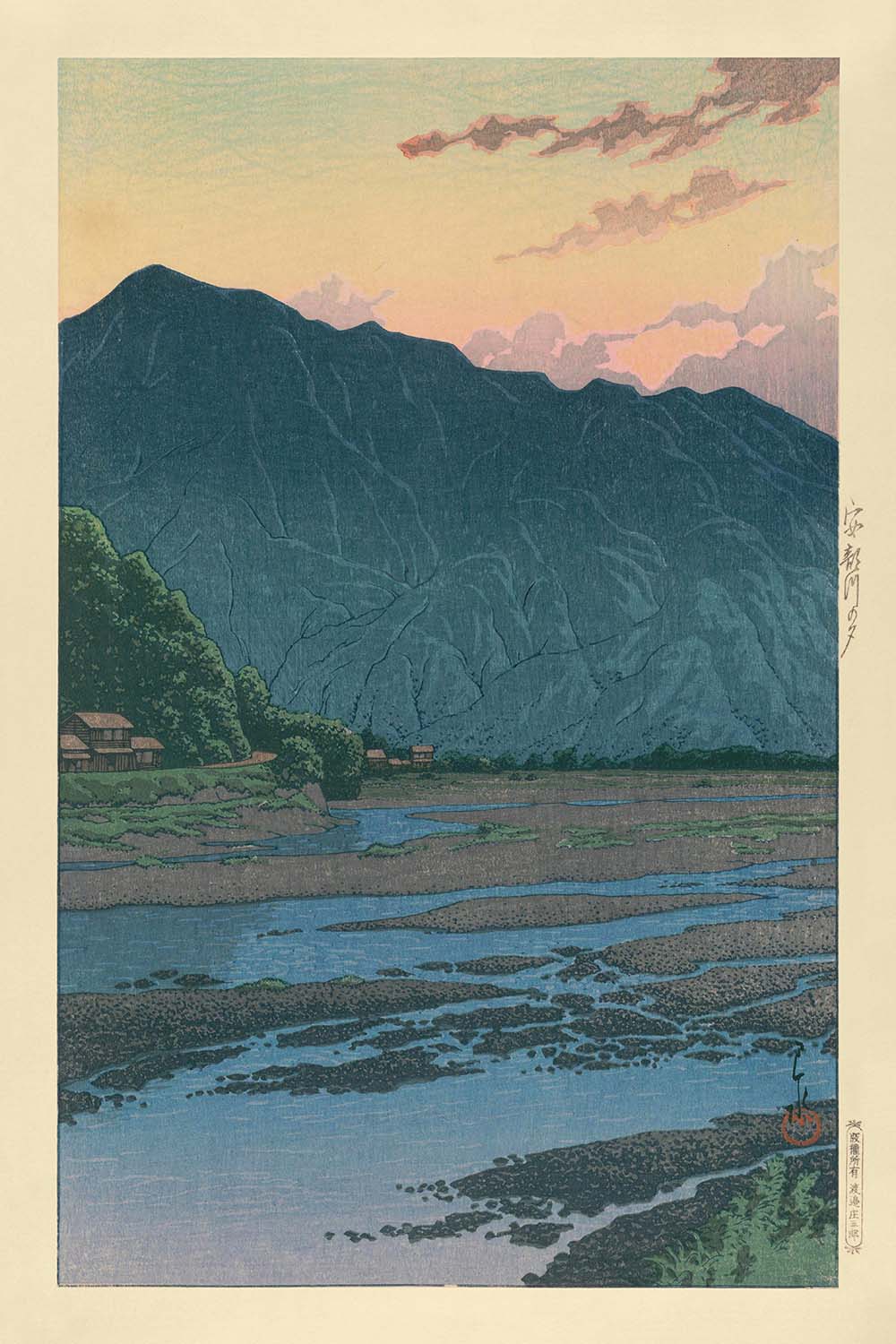 Hasui Kawase war eine zentrale Figur in der Wiederbelebung des Ukiyo-e, die dieser klassischen Form eine moderne Sensibilität verlieh und dabei die charakteristische ruhige Ästhetik beibehielt. "Berg Sonnenuntergang und Schlammiger Fluss" exemplifiziert Kawases Hingabe an die natürliche Schönheit, mit einem komplexen Zusammenspiel der lebhaften blauen und beruhigenden grünen Töne, die die Szene dominieren. Der ruhige Fluss spiegelt die atemberaubenden Farben des Himmels wider und schafft eine Szene atemberaubender Ruhe.