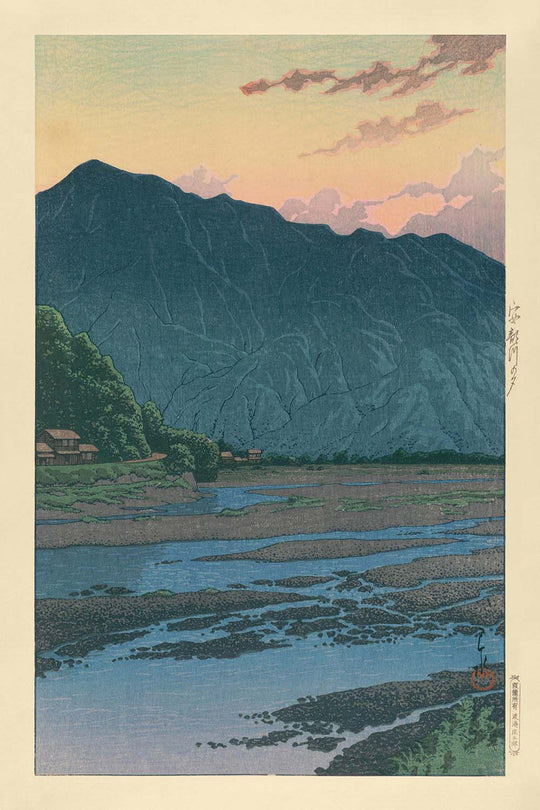 Der "Berg Sonnenuntergang und Schlammiger Fluss" von Hasui Kawase ist ein beeindruckender Holzschnitt, der 1935 geschaffen wurde. Dieses exquisite Kunstwerk ist ein Zeugnis von Kawases Meisterschaft der Shin-Hanga-Bewegung, die traditionelle japanische Holzschnitttechniken mit westlichen Stilen verband. Kawase wird für seine ruhigen Darstellungen der natürlichen Landschaften Japans gefeiert, die das ätherische Zusammenspiel von Licht und Schatten einfangen, das sein Werk charakterisiert.