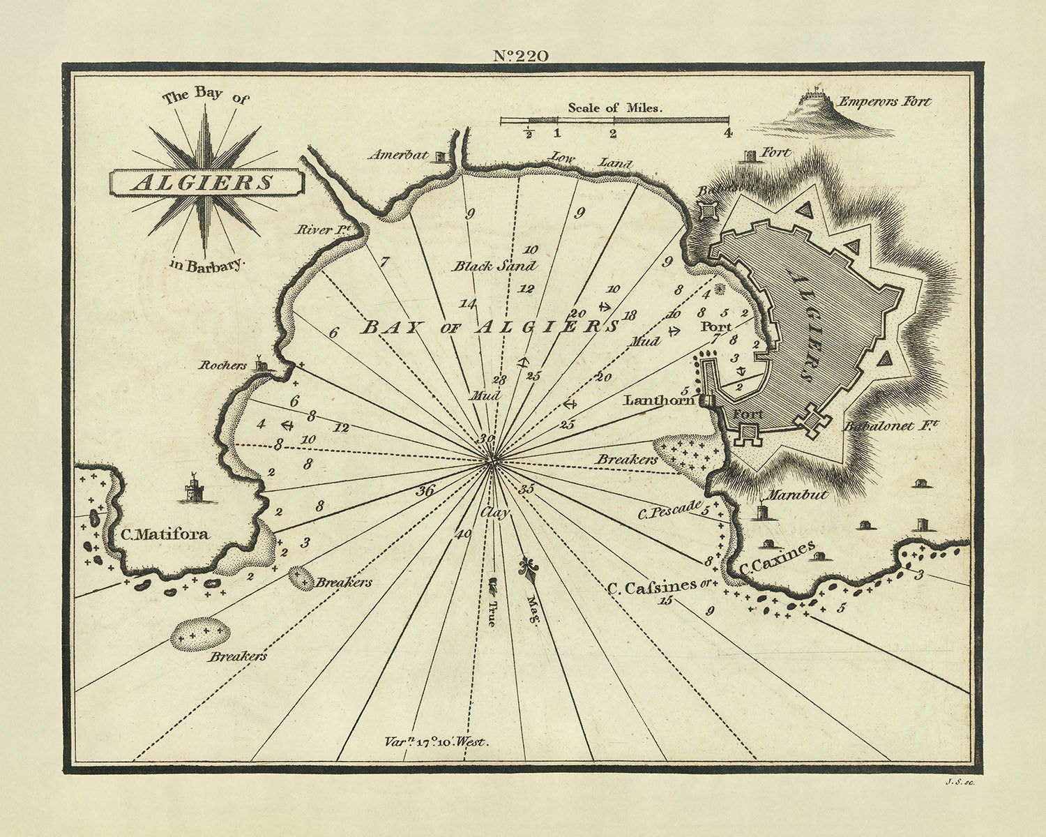 Alter Seekarten von Algier von Heather, 1802: Algerien, Osmanisches Regime, Befestigungen