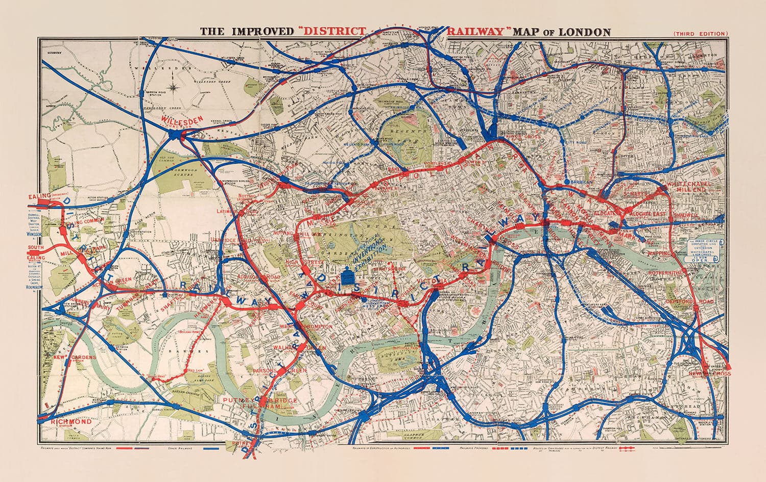 Diese Karte zeigt die District Railway in Rot und die von anderen Unternehmen betriebenen Eisenbahnen in Blau. Die Namen der anderen Eisenbahnbetreiber sind in roter Schrift über den Linien.