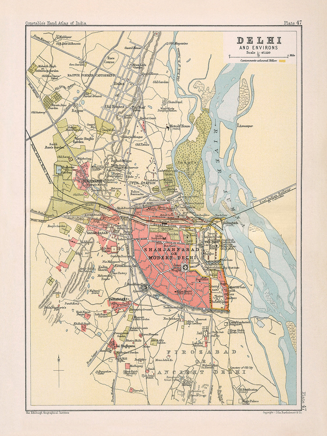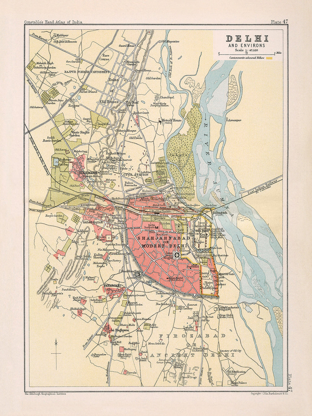 Bartholomews Verwendung von Farben und Schraffuren zur Darstellung des Reliefs erweckt die Karte zum Leben und bietet eine dreidimensionale Perspektive von Delhis Gelände. Die gelb gefärbten Kantonmente stechen hervor und betonen die militärische Präsenz, die während der Kolonialzeit ein bedeutender Aspekt der Stadtlandschaft war. Diese Karte ist nicht nur eine kartografische Leistung; sie ist ein historisches Dokument, das die Essenz von Delhi einfängt, was sie zu einer wertvollen Ergänzung jeder Sammlung antiker Karten macht und ein perfektes Stück für diejenigen, die die reiche Vielfalt der Geschichte und Geografie zu schätzen wissen.