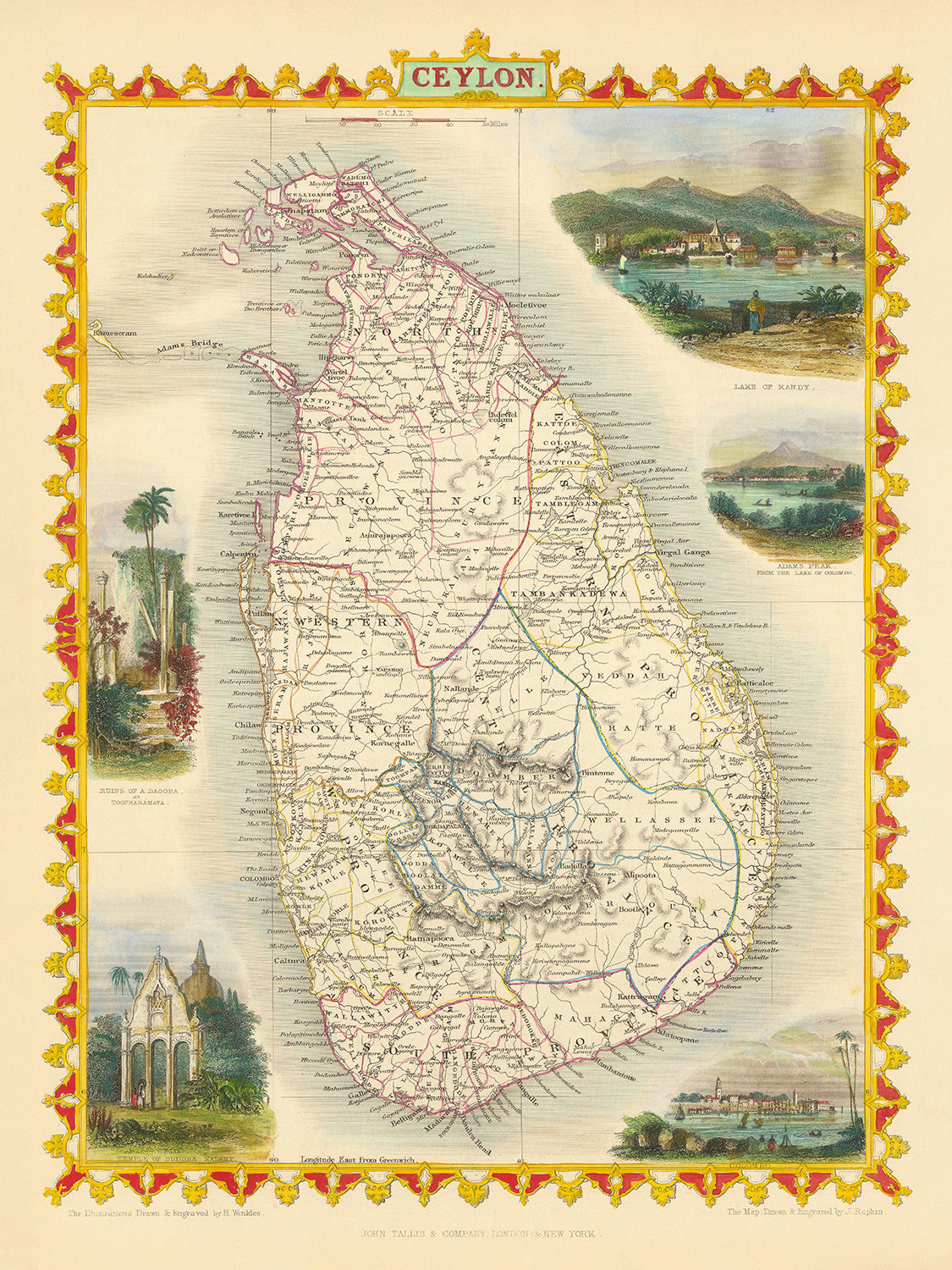 Alte Karte von Sri Lanka von Tallis & Rapkin, 1851: Ceylon, Colombo, Kandy, Tempel des Buddha, Ruinen von Dagora
