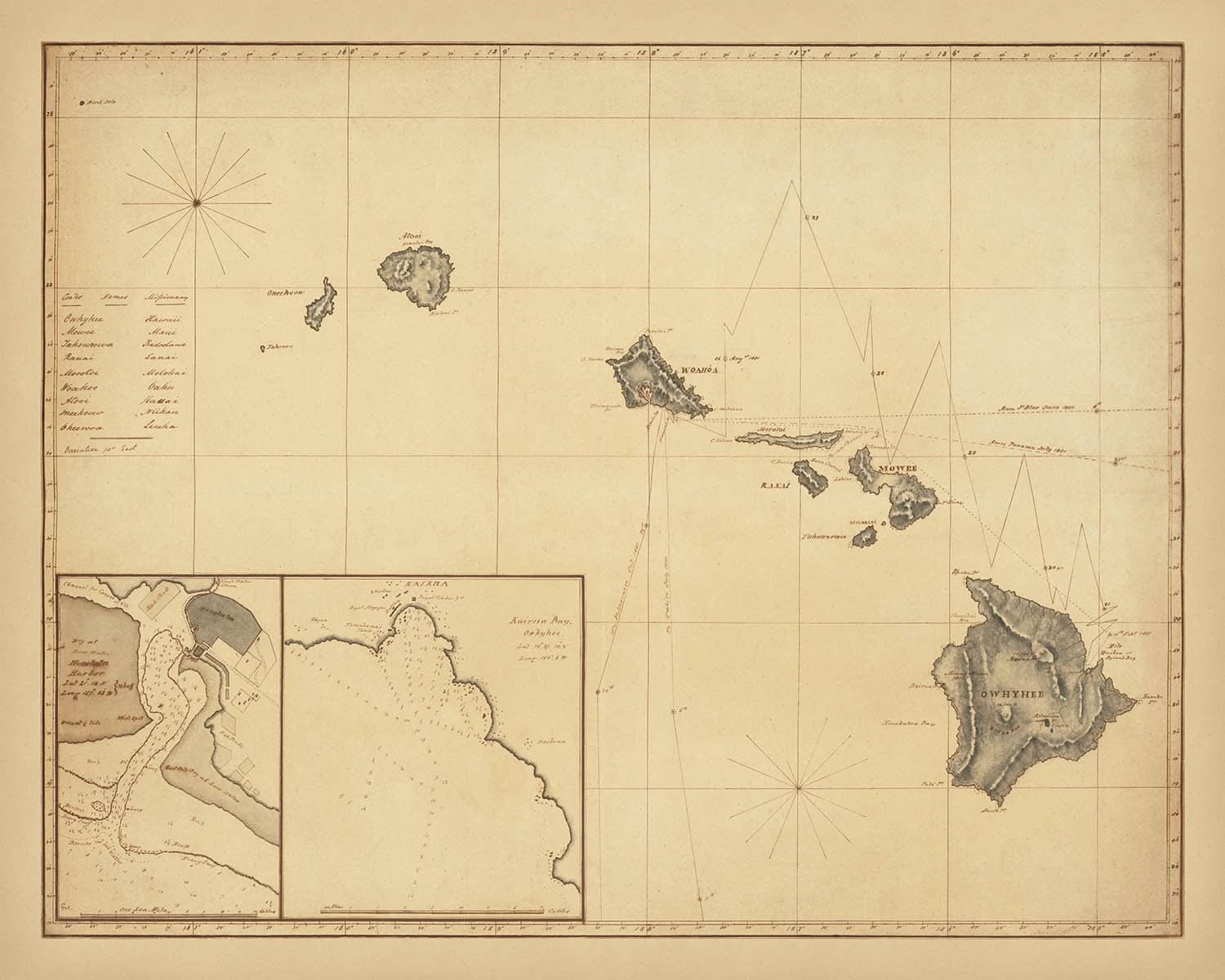 Die detaillierten Einschübe des Hafens von Honolulu und der Kailua Bay geben einen Einblick in die geschäftige maritime Aktivität der damaligen Zeit. Der Hafen von Honolulu ist mit Tiefenangaben, Gezeiteninformationen und dem Grundriss des Dorfes dargestellt und bietet eine lebendige Darstellung eines Hafens voller Leben. Die Kailua Bay mit ihren beschrifteten Gebäuden wie dem Royal Magazine und dem Royal Timber Yard spiegelt die Bedeutung dieser Ankerplätze für die hawaiianische Monarchie und die frühen Schifffahrtsrouten wider. Diese Einschübe basieren auf früheren Vermessungen und verbinden historische Genauigkeit mit künstlerischer Präzision.