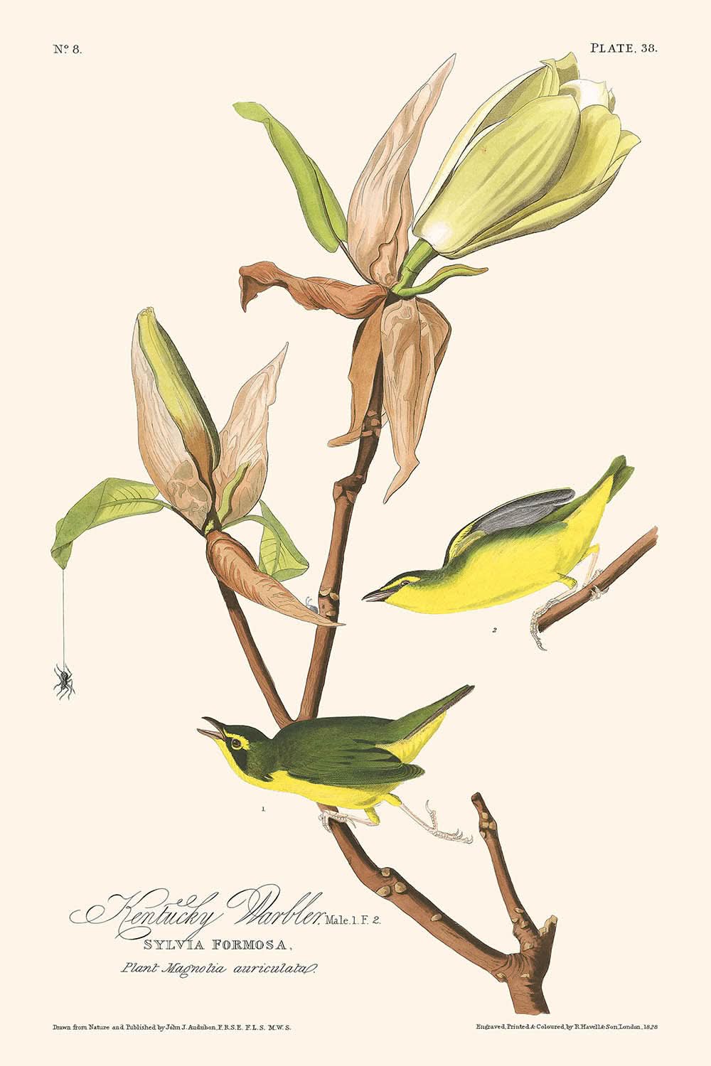 Kentucky-Waldsänger (Tafel 38) von John James Audubon ist eine exquisite Illustration aus seiner berühmten Serie „Birds of America“. Dieses 1827 geschaffene Kunstwerk fängt das Wesen des lebhaften und lebendigen Kentucky-Waldsängers ein, einer Art, die häufig in den üppigen Landschaften Louisianas und entlang des Mississippi zu finden ist. Audubons Hingabe zum Detail und zur natürlichen Schönheit erstrahlt in dieser hervorragenden Darstellung des Vogels in seinem natürlichen Lebensraum.