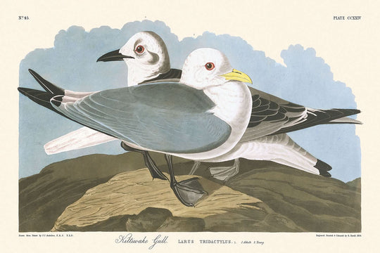 Die Abbildung der Dreizehenmöwe ist besonders bemerkenswert, da sie das zarte Gefieder und das pulsierende Leben des Vogels an den amerikanischen Küsten zeigt. Audubons Liebe zum Detail hebt nicht nur die körperlichen Merkmale des Vogels hervor, der wissenschaftlich als Larus tridactylus bekannt ist, sondern auch die dynamische Natur seiner Umgebung und bietet so einen Einblick in die Welt des Vogels.