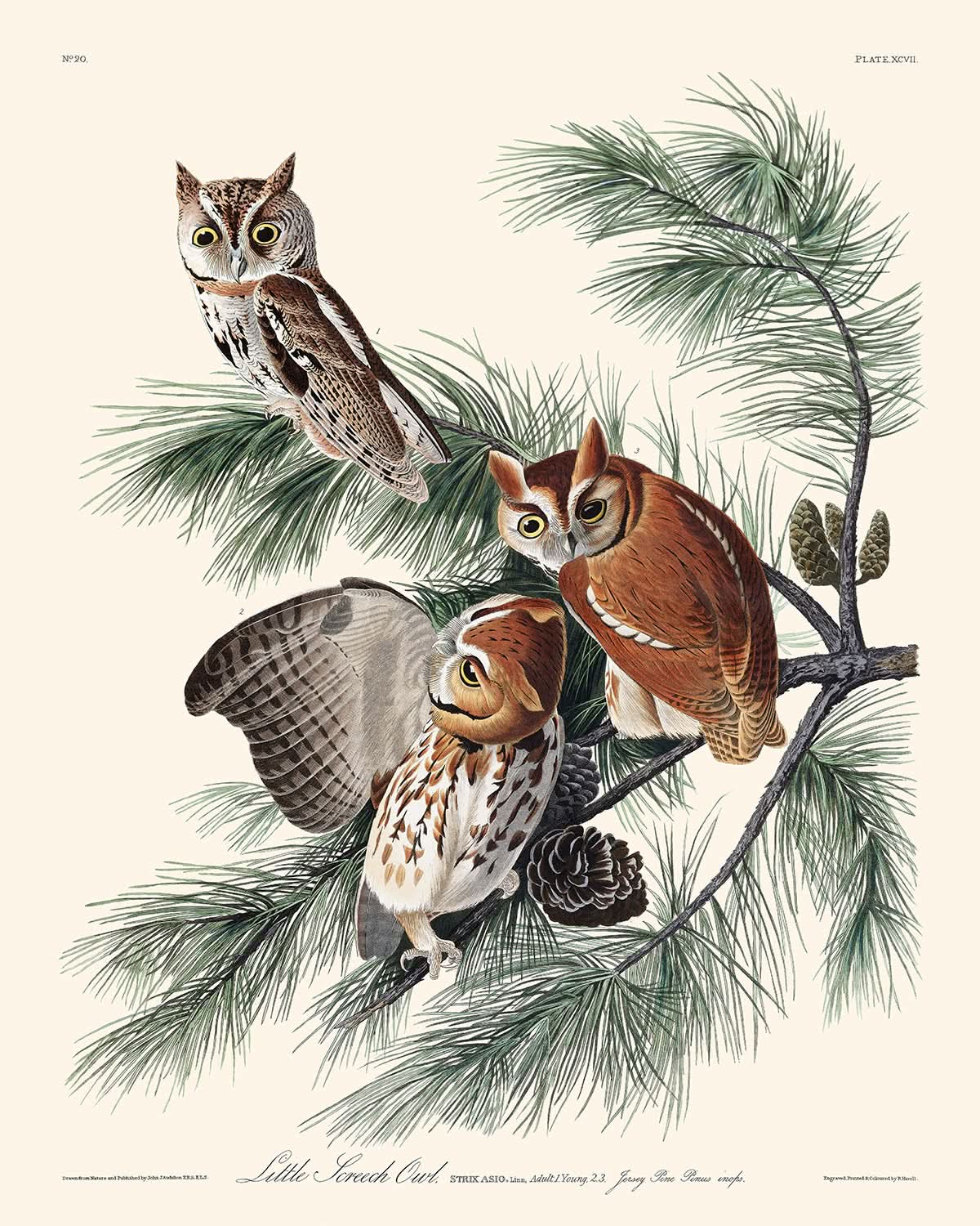 Die detailreiche visuelle Darstellung, die Audubon in diesem Druck bietet, ist bemerkenswert; von der präzisen Darstellung der subtilen Färbung und Textur der Eule bis hin zu den eindrucksvollen Szenen ihres natürlichen Lebensraums. Die wissenschaftliche Präzision und ästhetische Eleganz machen ihn zu einer außergewöhnlichen Ergänzung für jede Kunstsammlung oder Galerie eines Naturliebhabers. Der Strix Asio ist mit einer Reihe erdiger Töne im Gefieder dargestellt – eine ansprechende Mischung aus hellbraunen, tiefroten Farbtönen und gefleckten Mustern, die das Wesen dieses faszinierenden Vogels einfangen.