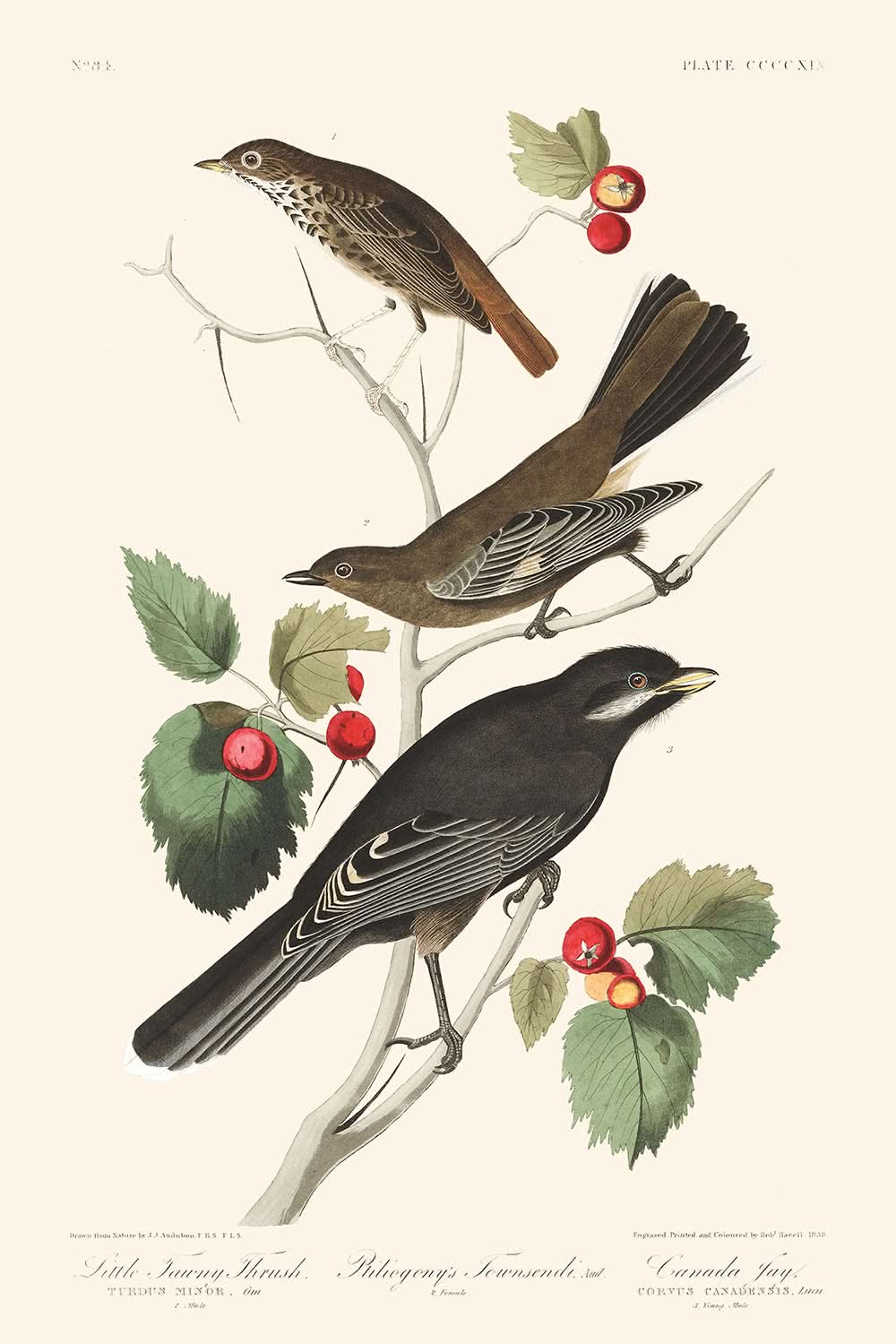 Little Tawny Thrush, Ptiliogony's Townsendi, Canada Jay von John James Audubon, erstmals 1827 veröffentlicht, ist eine fesselnde Illustration aus der berühmten Birds of America-Reihe. Audubon, der für seine akribische Liebe zum Detail und lebensechte Darstellungen von Vogelarten bekannt ist, hat das Wesen der Little Tawny Thrush und des Canada Jay mit bemerkenswerter Präzision eingefangen und ihre charakteristischen Merkmale und Lebensräume hervorgehoben.