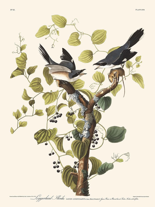 Der Loggerhead Shrike von John James Audubon wurde 1827 als Teil seines monumentalen Werkes, The Birds of America, veröffentlicht. Diese detaillierte Vogelillustration fängt das Wesen und den Lebensraum des markanten Loggerhead Shrike ein, eines Vogels, der in den Südstaaten Nordamerikas heimisch ist.