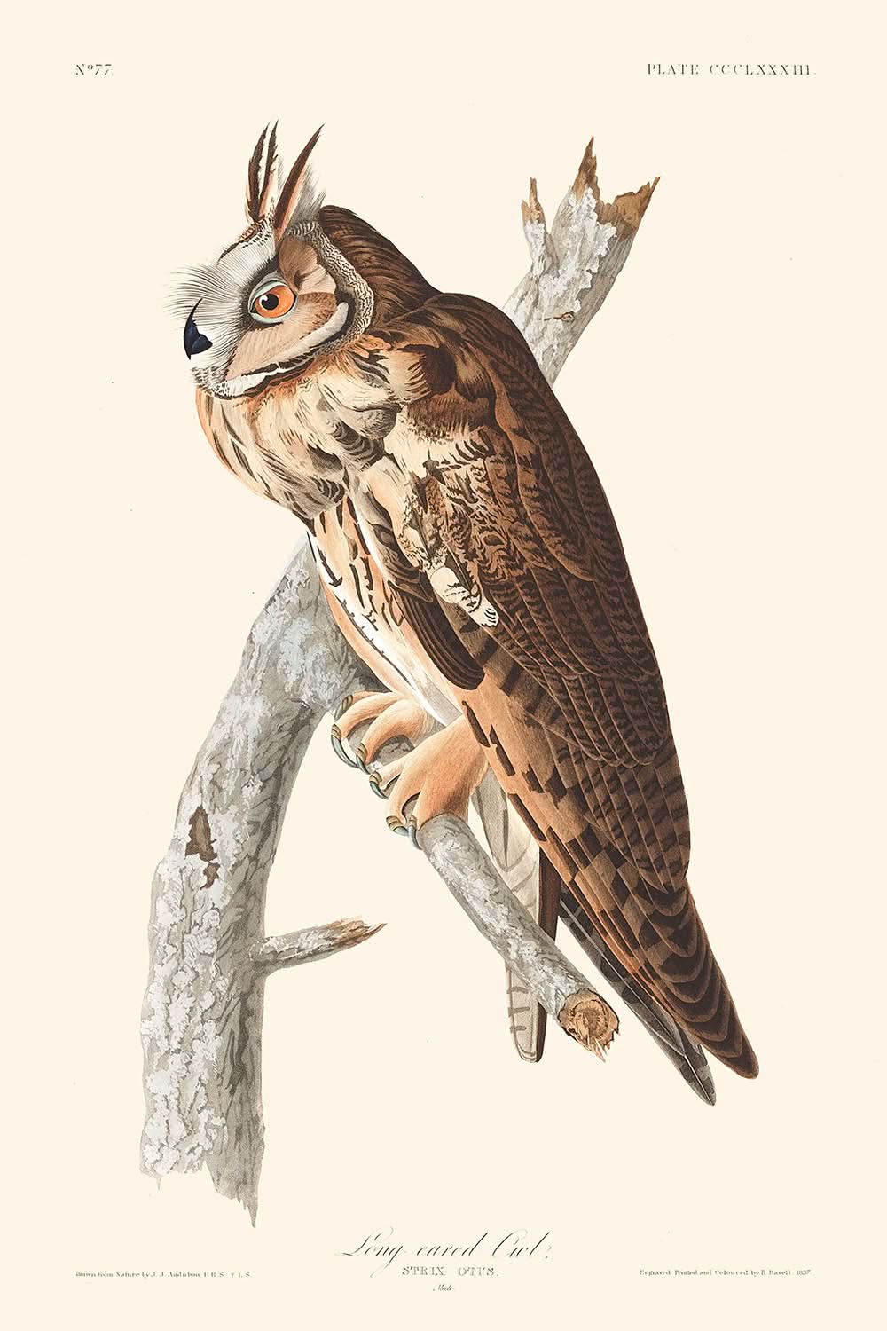 Der Künstler John James Audubon wird für seine außergewöhnlichen Beiträge zur Naturgeschichte durch seine Illustrationen gelobt. Seine lebensgroßen Darstellungen ermöglichten es dem Publikum, die Erhabenheit und die feinen Nuancen des Vogellebens zu beobachten. Die „Waldohreule“ bietet einen detaillierten Einblick in diese schwer fassbare Vogelart, da Audubon nicht nur ihr Aussehen, sondern auch ihre eigentümliche Sitzhaltung am Tag und ihre Vorlieben für Waldlebensräume festhält. Seine Notizen legen nahe, dass der Vogel häufiger in den Waldgebieten der Mittleren und Östlichen Atlantikregion gesichtet wurde, was einen weniger verbreiteten Einblick in seinen Lebensraum und seine Verhaltensmuster bietet.