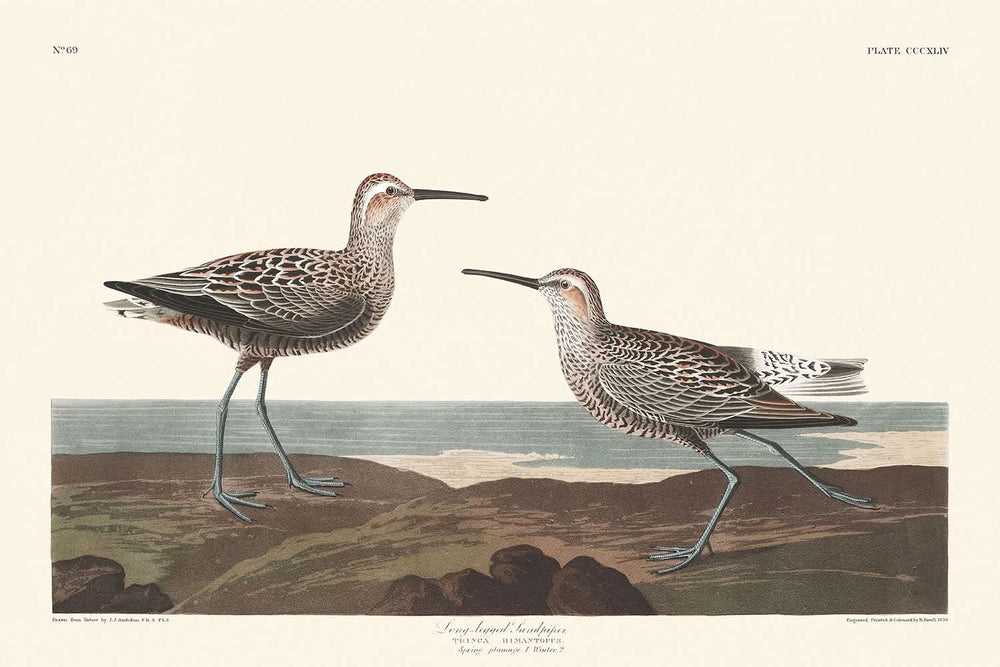 Wir stellen Ihnen „Long-legged Sandpiper“ des renommierten Naturforschers und Künstlers John James Audubon vor. Diese exquisite Illustration, die erstmals 1827 veröffentlicht wurde, ist ein bemerkenswertes Stück aus der berühmten „Birds of America“-Sammlung. Audubons Werk ist ein Zeugnis einer vergangenen Ära sorgfältiger Naturbeobachtung und künstlerischer Fertigkeit und fängt die Schönheit und das Wesen der Vogelwelt mit beispielloser Detailtreue ein.