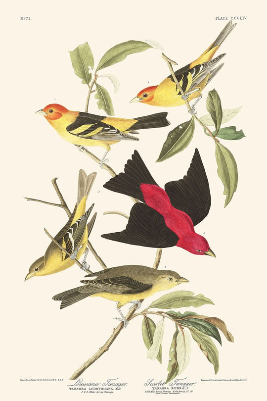 Diese lebhaften Illustrationen zeichnen sich durch eine reiche Farbpalette aus: Der karminrote Kopf des Louisiana-Tangarens geht anmutig in leuchtendes Gelb über, das durch kräftige schwarze Akzente auf den Flügeln und dem Rücken hervorgehoben wird. Diese lebendige Verwendung von Farben und exquisiten Details bietet dem Betrachter einen intimen Einblick in die Vogelwelt und verstärkt den Reiz dieses Kunstwerks.