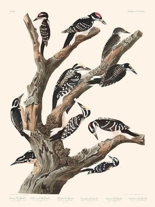 Der Specht von Maria, der Dreifinger-Specht, der Specht von Phillips, der Kanadische Specht, der Specht von Harris und der Specht von Audubon (Tafel 417) fangen das Wesen der lebendigen und komplexen Illustrationen aus der renommierten Sammlung von John James Audubon, "Vögel von Amerika", ein. Diese Illustration, die 1827 erstellt wurde, bietet einen Einblick in die avianischen Wunder, die Audubon akribisch dokumentiert hat – ein Beweis für sein Engagement, die natürliche Welt zu verstehen und darzustellen.