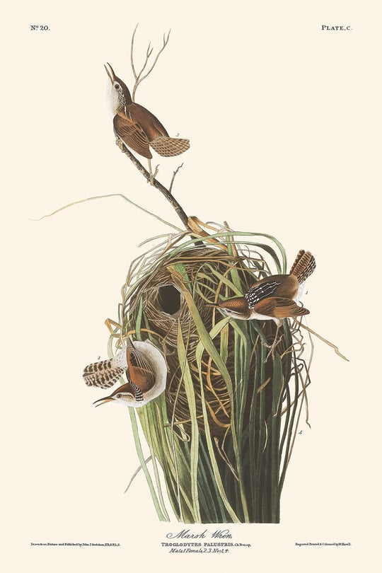 „Sumpfzaunkönig“, erstmals 1827 veröffentlicht, ist eine der faszinierendsten Vogelillustrationen aus John James Audubons berühmter Serie „The Birds of America“. Dieses besondere Kunstwerk fängt das Wesen des Sumpfzaunkönigs ein und zeigt seinen natürlichen Lebensraum an der Atlantikküste und den Sümpfen an den Flussmündungen.