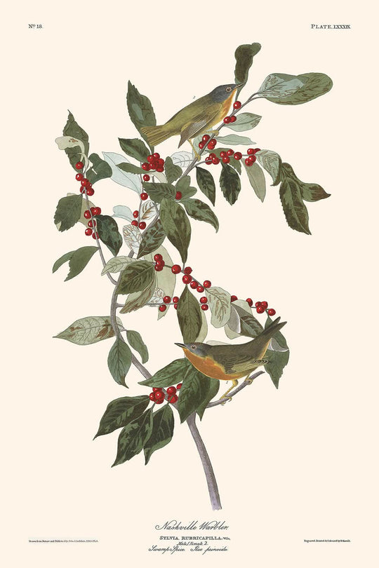Audubons Nashville-Waldsänger ist eine exquisite Darstellung sowohl künstlerischer als auch ornithologischer Expertise. Ursprünglich begegnete Audubon nur einigen wenigen Exemplaren an Orten wie Louisiana und Kentucky. Er erweckte seine Beobachtungen in diesem winzigen Vogel mit hervorragender Liebe zum Detail zum Leben – von seinen bräunlich-grünen oberen Federn bis zu den auffälligen grünlich-gelben Unterseiten und einem Hauch von markantem Dunkelrot auf der Krone des Männchens. Seine kunstvolle Darstellung umfasst auch Elemente seines natürlichen Lebensraums, wie die Sumpf-Wurzel (Ilex prinoides), was botanisch interessant ist.