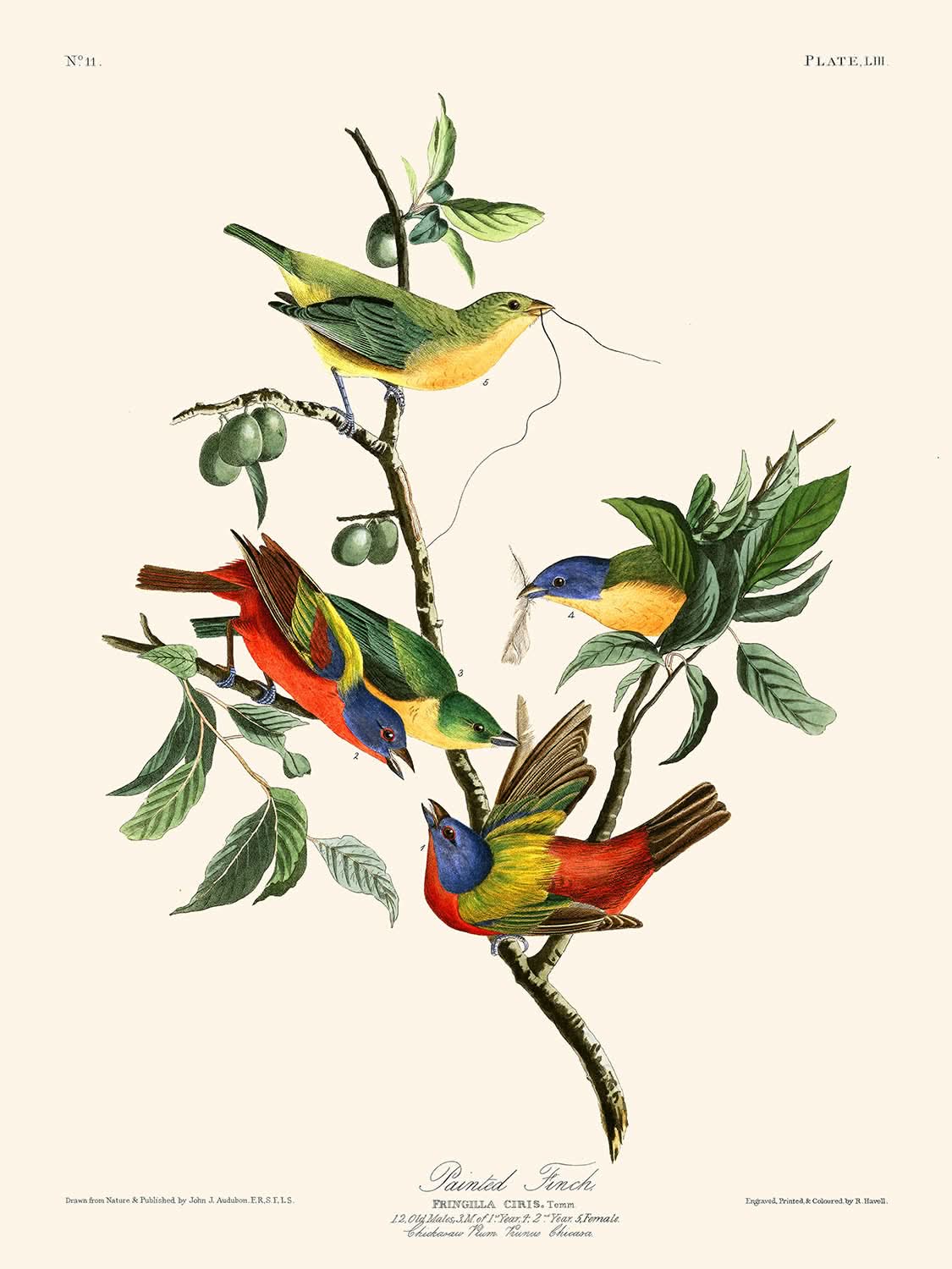 Der bemalte Finken (Tafel 53) veranschaulicht Audubons meisterhafte Liebe zum Detail und die komplexe Schönheit der Vogelwelt. Seine Arbeit zeichnet sich durch lebensechte Darstellungen mit zarter Pinselführung aus, die das leuchtende Gefieder und die charakteristischen Formen jeder Art einfangen. Die farbenfrohe Darstellung des bemalten Finken in seinem natürlichen Lebensraum zeigt Audubons beispielloses Talent und seine Fähigkeit, dem Betrachter die Natur näher zu bringen.