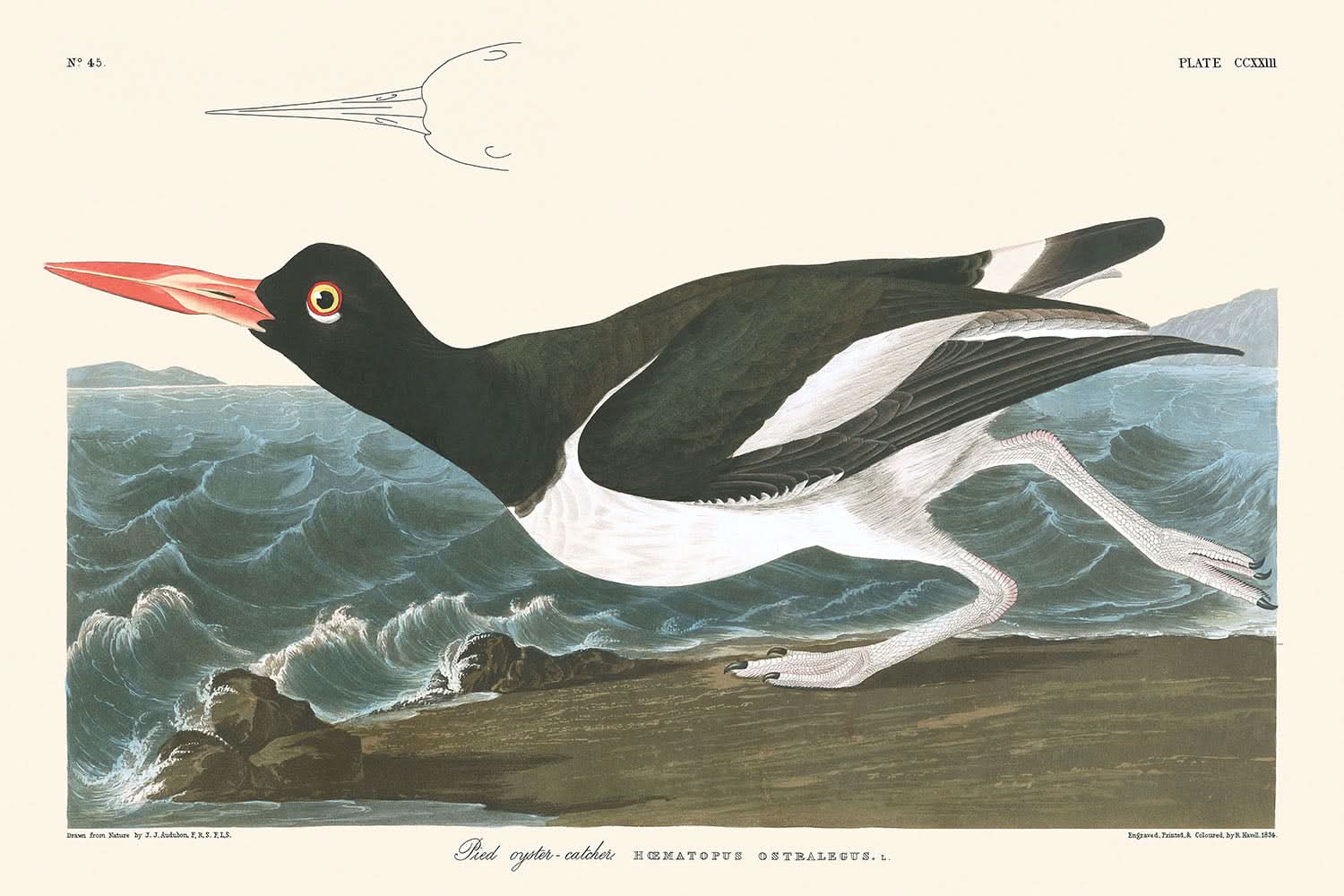 Die Abbildung des Austernfischers fasst die Essenz von Audubons Arbeit wunderbar zusammen und zeigt das charakteristische schwarz-weiße Gefieder des Vogels mit lebendigen Details und Genauigkeit. Bekannt für seine wissenschaftliche Bezeichnung als Haematopus longirostris, der Austernfischer ist eine bemerkenswerte Art, die mit jedem bewussten Strich und jeder Farbwahl von Audubon treffend eingefangen wird, was den Druck zu einer faszinierenden Ergänzung für jede Sammlung macht.