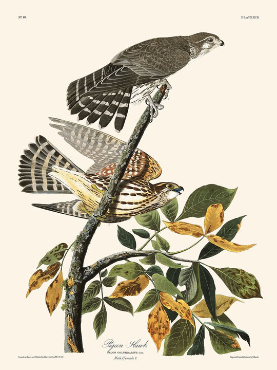 Pigeon Hawk (Tafel 92) von John James Audubon, erstmals 1827 veröffentlicht, ist eine faszinierende Vogelillustration aus Audubons berühmter Serie Birds of America. Diese Illustration fängt nicht nur die majestätische und schwer fassbare Natur des Pigeon Hawk ein, sondern befasst sich auch mit seiner weiten Verbreitung in den Vereinigten Staaten und darüber hinaus und zeichnet eine lebendige Geschichte seiner Migrationsmuster und Lebensräume.