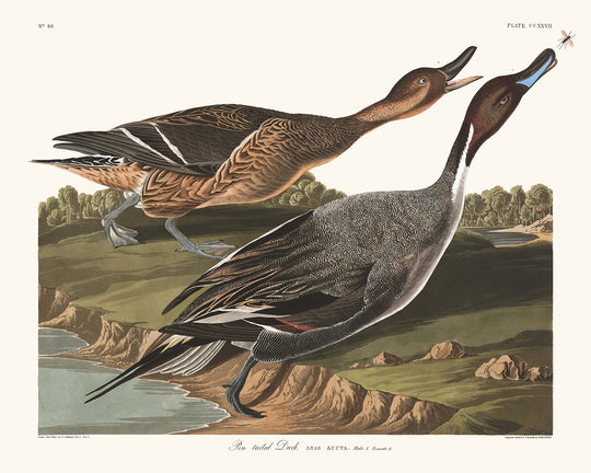 „Pin Tailed Duck, Male and Female“, erstmals 1827 veröffentlicht, ist ein exquisites ornithologisches Kunstwerk von John James Audubon, Teil seiner monumentalen Serie „The Birds of America“. Dieses Kunstwerk fängt die komplizierten Details und die natürliche Schönheit der männlichen und weiblichen Spießente in ihrem natürlichen Lebensraum ein.