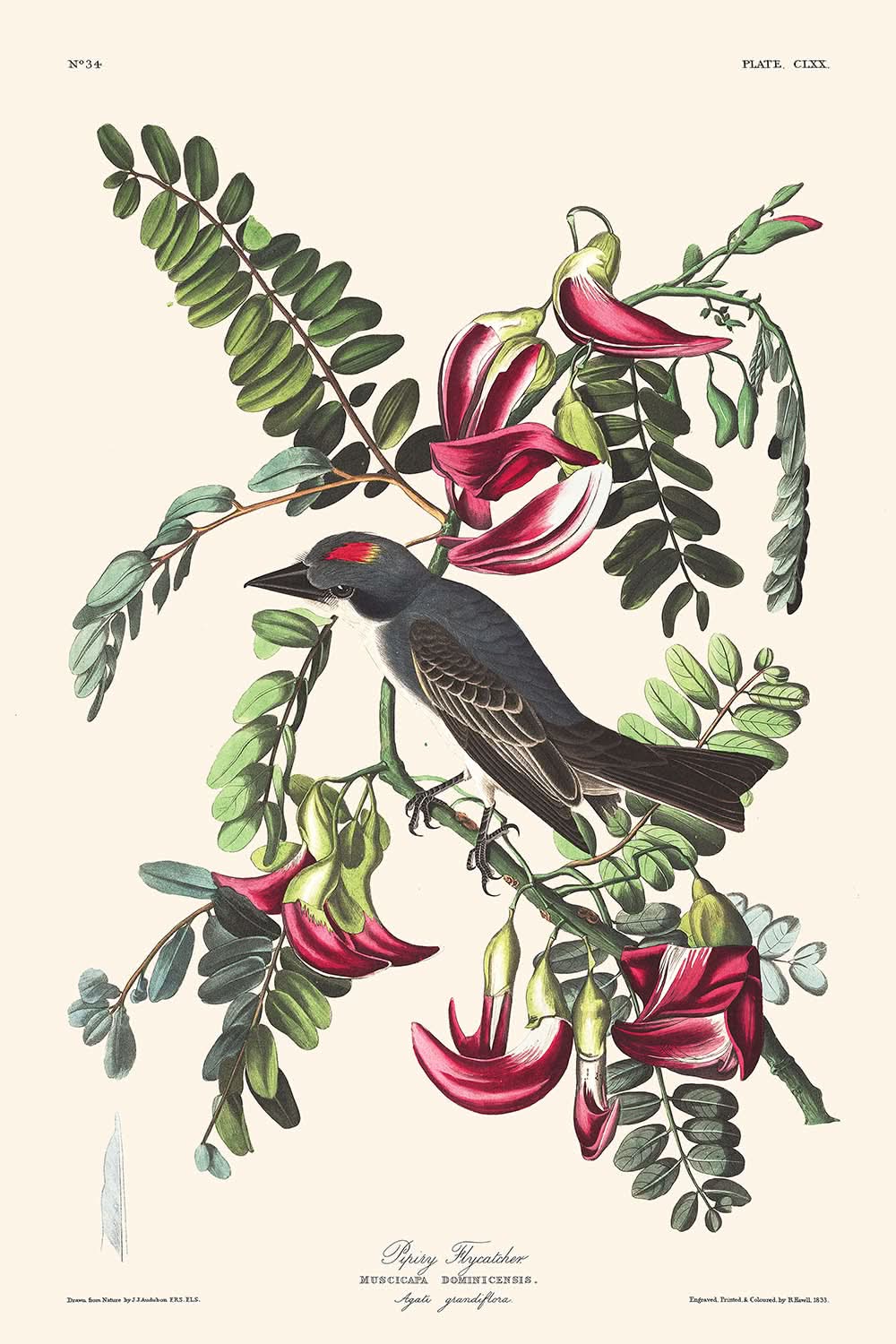 Die Illustration des Piping Flycatcher ist ein Beleg für Audubons Geschick, Vögel mit bemerkenswertem Realismus darzustellen. Die dynamische Komposition und die präzise Farbgebung spiegeln den geschickten Umgang des Künstlers mit Stil und Design wider und machen diesen Druck zu einem Gesprächsthema und Sammlerstück für jede Kunstsammlung. Die wissenschaftliche Bezeichnung dieser Art steigert ihren Wert sowohl für Kunstliebhaber als auch für Vogelliebhaber.