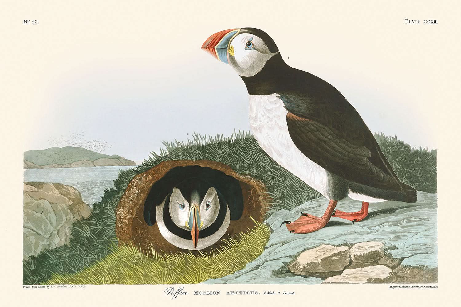 Dieses Papageientaucher-Kunstwerk ist nicht nur wegen seiner Darstellung des Vogels selbst (Mormon arcticus) bemerkenswert, sondern auch wegen der Detailgenauigkeit seiner Umgebung und seines Verhaltens, wie es Audubon auf seinen Expeditionen beobachtete. Die Feinheiten der gegrabenen Lebensräume und die auffällige Interaktion zwischen Papageientauchern werden meisterhaft eingefangen und bieten eine spannende historische Erzählung, die Vogelliebhaber und Kunstliebhaber gleichermaßen verzaubert.