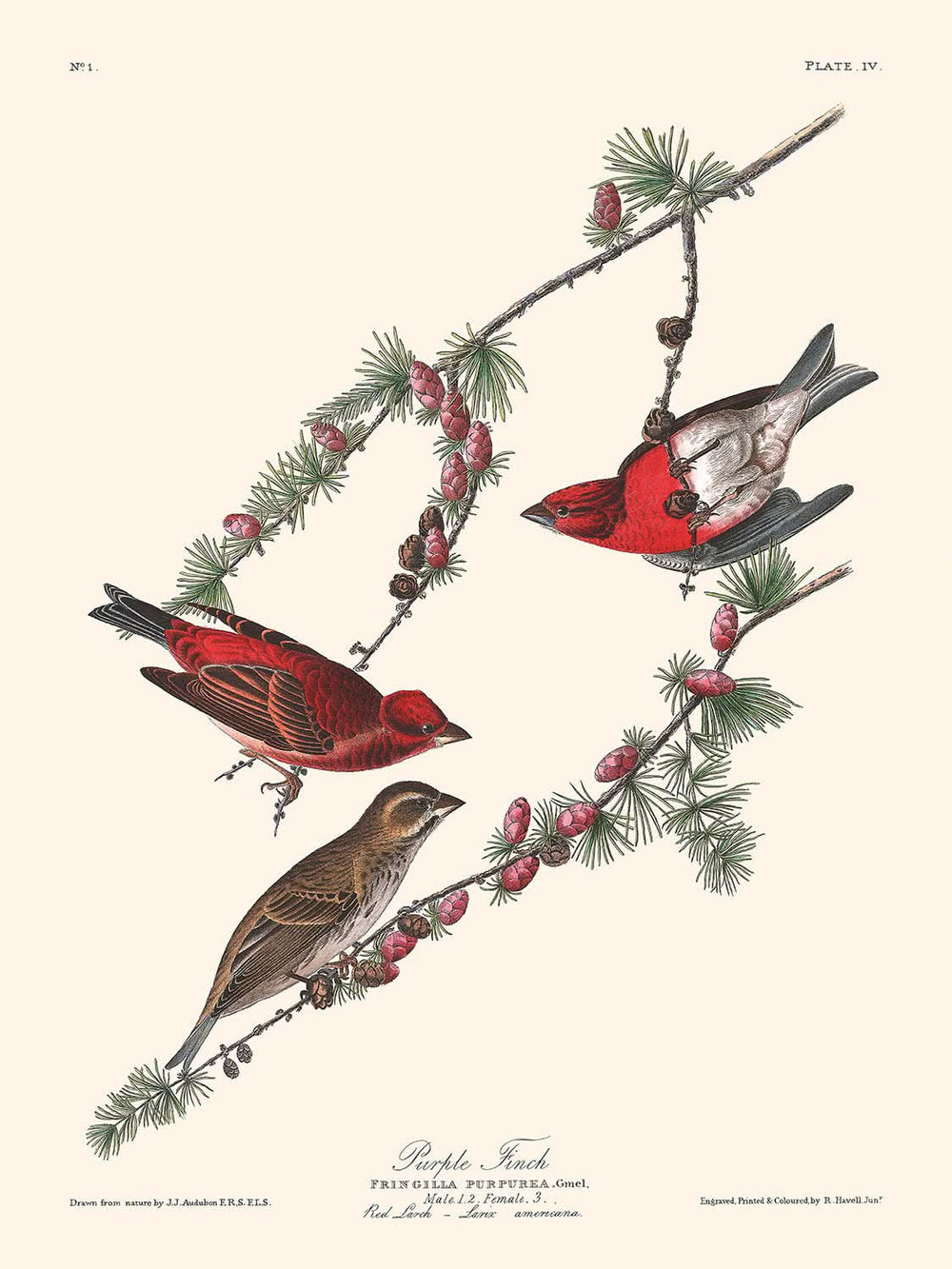 „Purple Finch“ von John James Audubon, ursprünglich 1827 veröffentlicht, ist eine atemberaubende Illustration aus der gefeierten „Birds of America“, einer Sammlung, die für ihre detaillierten und lebensgroßen Darstellungen von Vogelarten bekannt ist.