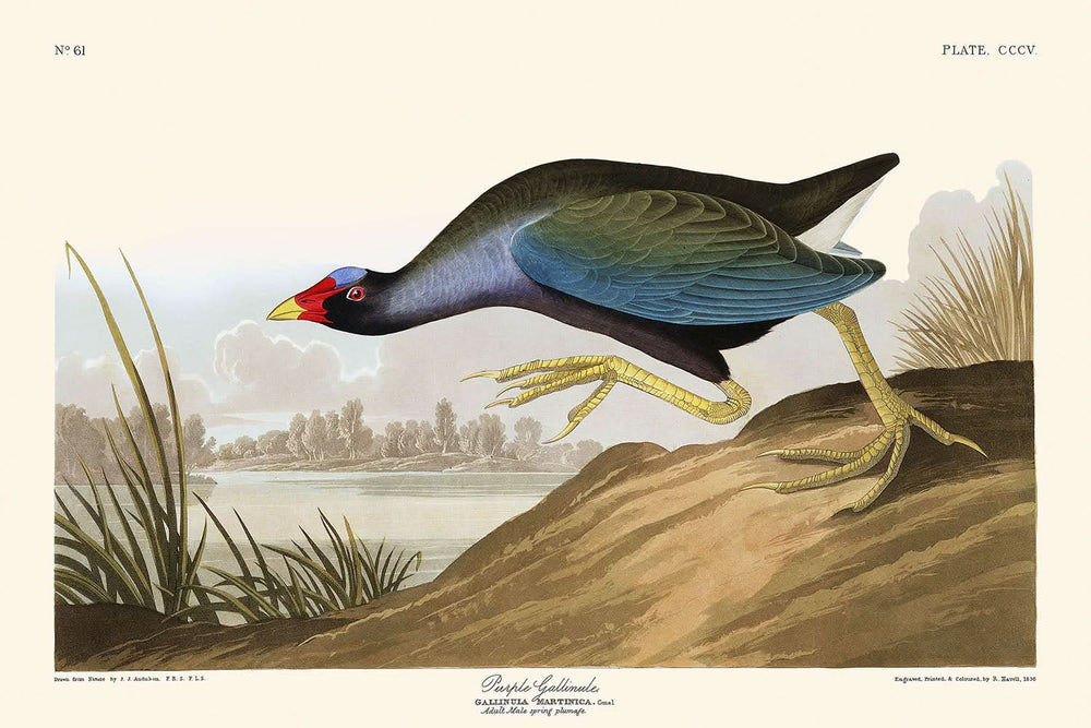 Audubon, ein gefeierter Naturforscher und Maler, revolutionierte die ornithologische Kunst mit seinen lebensechten Illustrationen. Die Serie „Birds of America“, die erstmals zwischen 1827 und 1838 veröffentlicht wurde, umfasst 435 lebensgroße Drucke, die in ihrem Umfang und ihrer Kunstfertigkeit beispiellos bleiben. Das Purpurhuhn selbst wird korrekt als Gallinula Porphyrio oder Gallinula martinica bezeichnet, was ein meisterhaftes Verständnis seiner Biologie und seines Verhaltens zeigt.