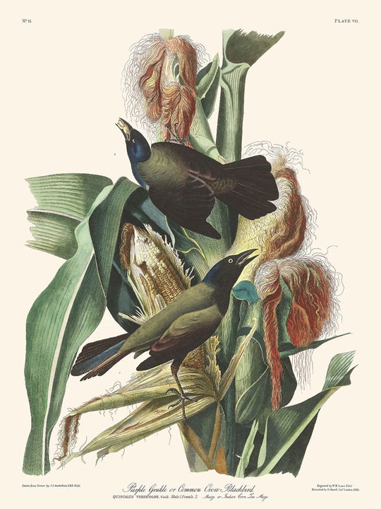 Purpurgrackle, oder Gemeiner Krähen-Schwarzvogel, geschaffen von dem renommierten Ornithologen und Maler John James Audubon, wurde 1827 erstmals als Teil der bahnbrechenden Sammlung "Vögel von Amerika" veröffentlicht. Diese Illustration fängt das reiche Gefieder und das faszinierende Verhalten des Purpurgrackles ein, eines Vogels, den Audubon lebhaft beschreibt, wie er seinen natürlichen Neigungen nachgeht.