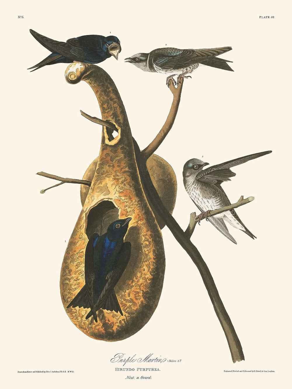 Der Purpur-Martin (Tafel 22), erstmals veröffentlicht im Jahr 1827, ist eine hochgeschätzte Illustration aus John James Audubons gefeierter Serie, Vögel von Amerika. Diese exquisite Darstellung fängt die lebendige Energie und das Migrationsverhalten des Purpur-Martins ein, einer Art, die für ihren agilen Flug und ihre sozialen Nistgewohnheiten bekannt ist.