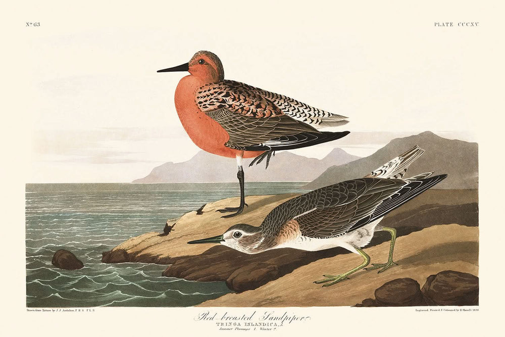 Der Zwergstrandläufer ist nicht nur wegen seiner Schönheit, sondern auch wegen seines faszinierenden Wanderverhaltens bemerkenswert. Der Knutt ist auf seiner Reise Richtung Norden oft in großen Schwärmen entlang der Atlantikküste zu sehen und ist ein Musterbeispiel für Anmut und Wendigkeit, sowohl im Flug als auch auf der Suche nach Nahrung, wenn er Ebbe und Flut folgt. Sein auffälliges Gefieder, das hier von Audubon detailliert dargestellt wird, fängt die rötlichen Töne des Vogels während der Brutzeit ein, im Kontrast zu seinen weicheren Winterfarben.