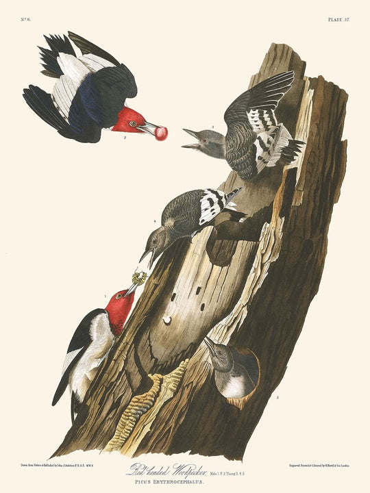 Dieses Kunstwerk ist bemerkenswert für seine Darstellung des Rotkopfspechts (Picus erythrocephalus), der für seinen auffälligen roten Kopf und seinen kontrastierenden schwarz-weißen Körper bekannt ist, den Audubon mit beeindruckendem Realismus einfängt. Das Verhalten und der Lebensraum des Vogels werden mit lebendiger Klarheit dargestellt und laden den Betrachter ein, einen Moment in der amerikanischen Wildnis zu erleben.