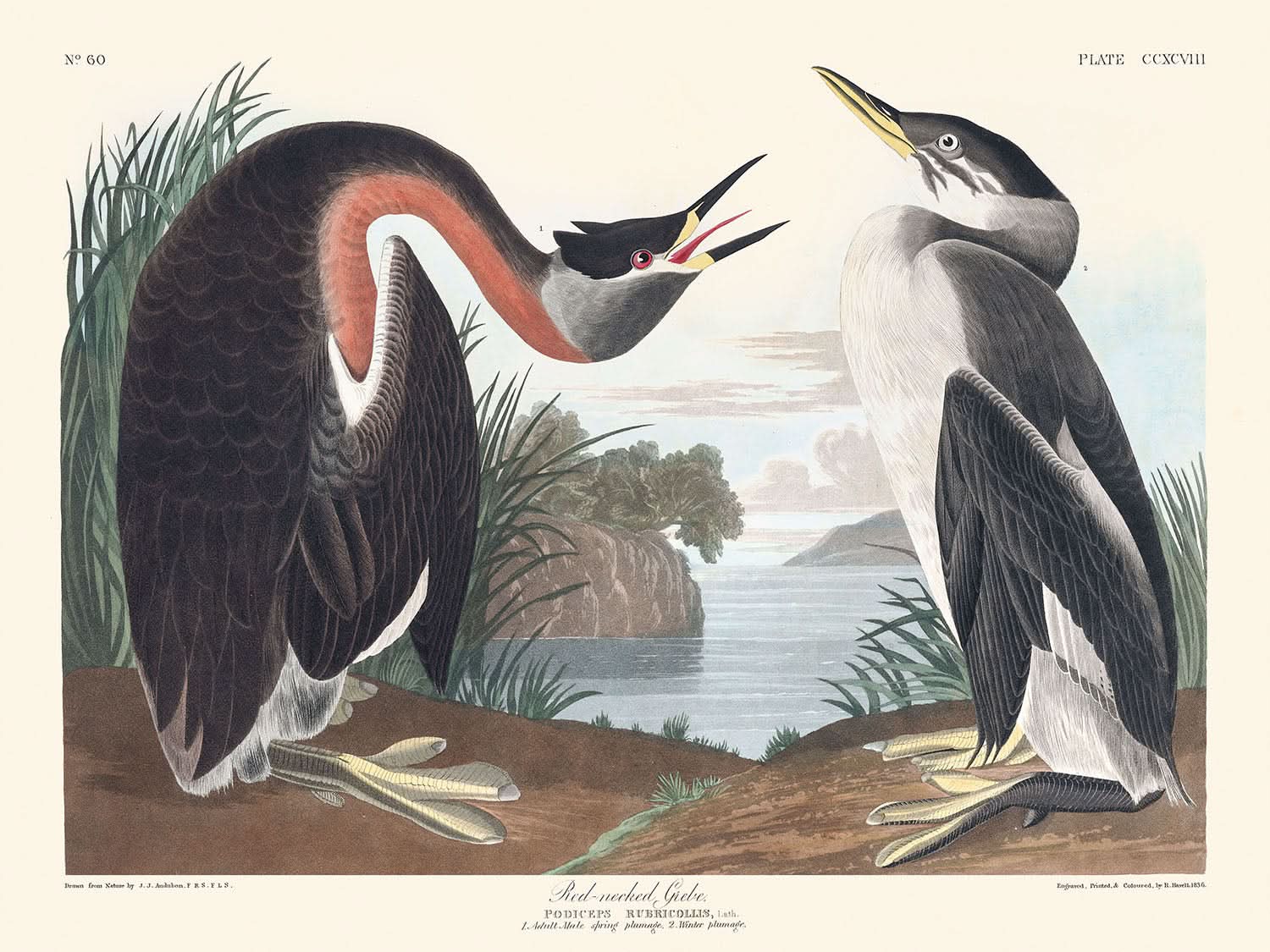 John James Audubon, bekannt für seinen umfassenden Katalog amerikanischer Vogelarten, ist eine zentrale Figur sowohl in der Kunst als auch in der Naturgeschichte. Sein Engagement für die Erstellung lebensechter, detailliert ausgearbeiteter Illustrationen hat einen Standard für die Tierkunst gesetzt. Der Rotnackentaucher fängt insbesondere das Wesen einer Art ein, die Audubon in nördlichen Lebensräumen beobachtet hat und wissenschaftlich als Podiceps rubricollis bekannt ist.