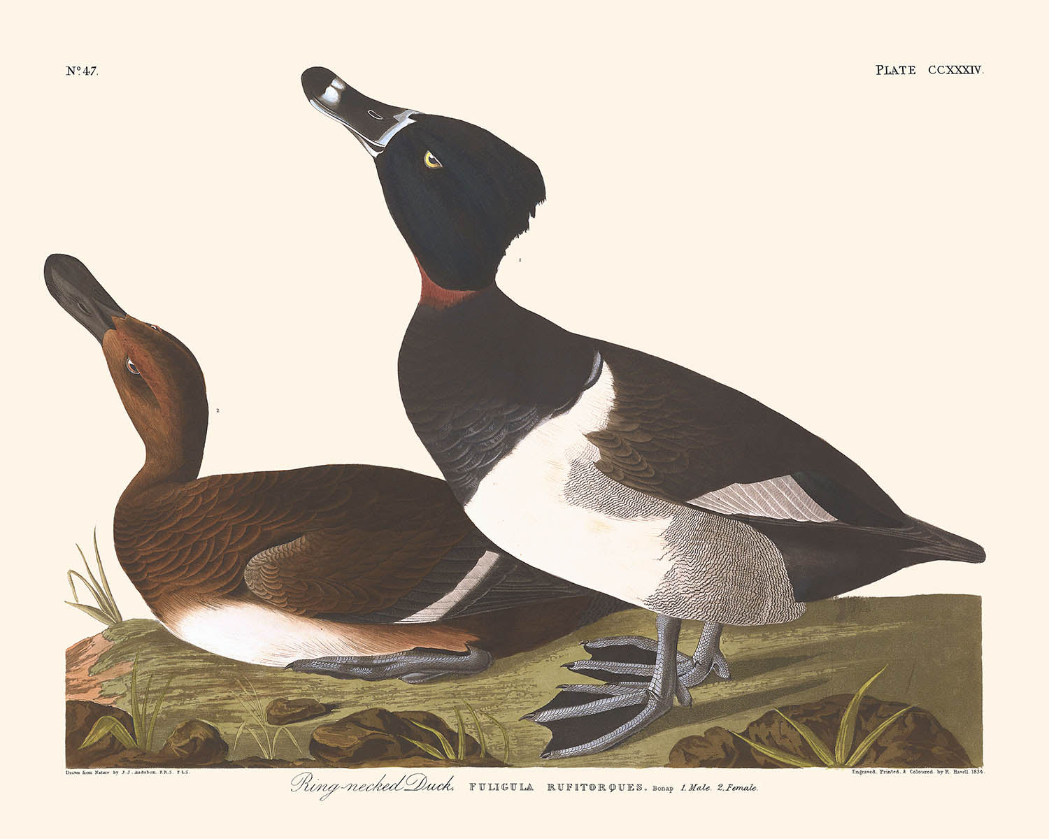 John James Audubon, eine führende Figur in der frühen amerikanischen Naturwissenschaftsillustration, erreichte ein unerreichtes Maß an Anerkennung für seine präzisen Darstellungen des Vogellebens, die tiefen Respekt und Faszination für die Tierwelt einbetten. Dieses Kunstwerk sticht hervor und illustriert die exquisiten Merkmale der Ringhalsente – von dem kräftigen schwarzen Gefieder mit subtilen blaugrauen und rötlichen Akzenten, die den Hals umgeben, bis zu den zarten aschfarbenen Färbungen an den Flanken, künstlerisch dargestellt vor einem ruhigen und natürlichen Hintergrund.