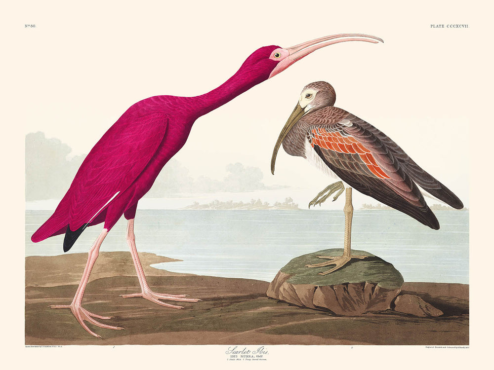 Bemerkenswerterweise wird der Scarlet Ibis für sein prächtiges scharlachrotes Gefieder gefeiert, das durch strahlend weiße Federn und bläulich-schwarze primäre Flügelspitzen ergänzt wird. Audubon betont die auffälligen Farbkontraste—lebhaftes Scharlachrot, das mit subtilen Farbtönen kontrastiert, die der Komposition Tiefe verleihen. Dieser Kontrast wird durch die blassen Teichtöne des Schnabels und der Füße des Vogels vor dem relativ gedämpften Hintergrund weiter verstärkt—ein Beweis für Audubons Geschick, eine Szene zu balancieren, die sowohl reich an Details als auch visuell ansprechend ist.