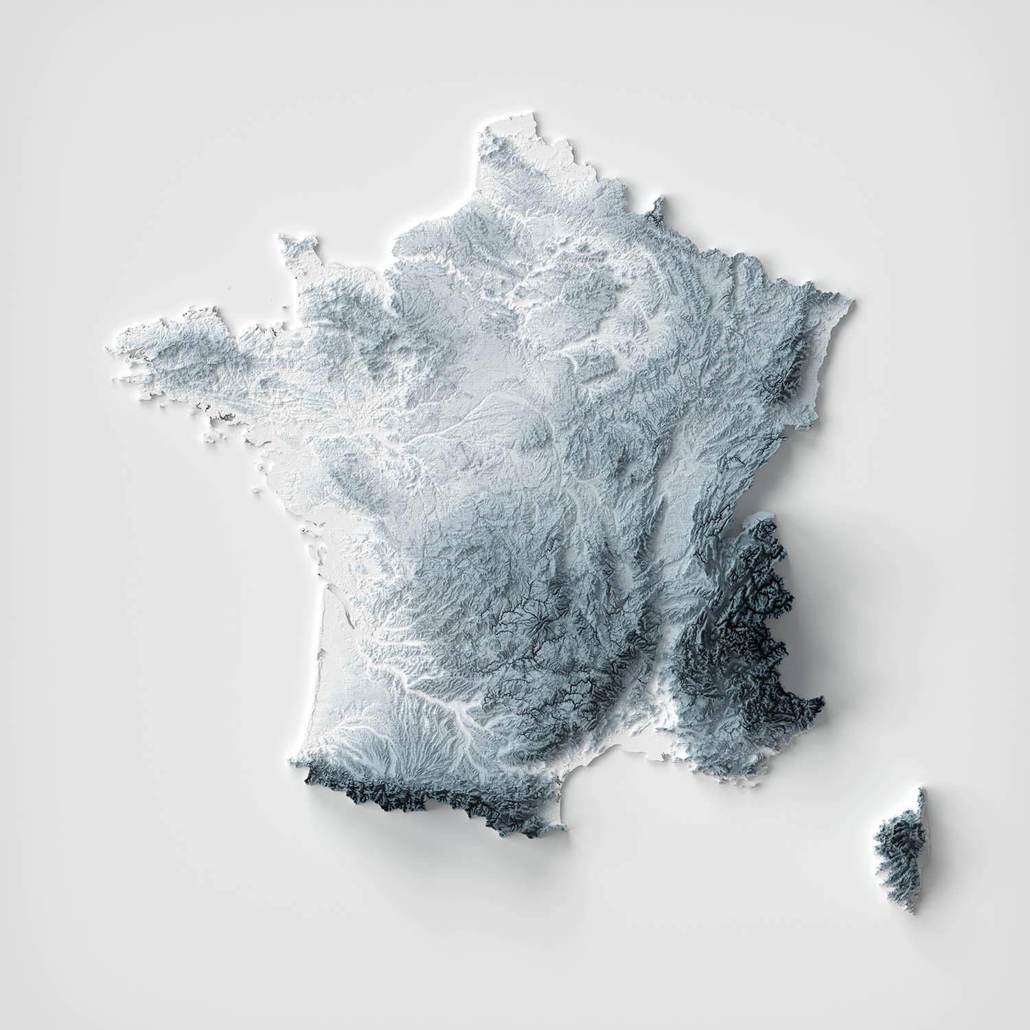 Feiern Sie die zeitlose Schönheit und bemerkenswerte Vielfalt Frankreichs mit dieser fesselnden Reliefkarte. Die Kunst der Topografie wird lebendig, während die ikonischen Landschaften Frankreichs in detaillierter Ausführung dargestellt werden, die alles von den höchsten Gipfeln Frankreichs bis zu seinen weitläufigen Küstenebenen hervorhebt. Subtile Licht- und Schatteneffekte verstärken den dreidimensionalen Eindruck, wodurch die Gebirgszüge und Flusstäler mit auffälliger Klarheit hervortreten.