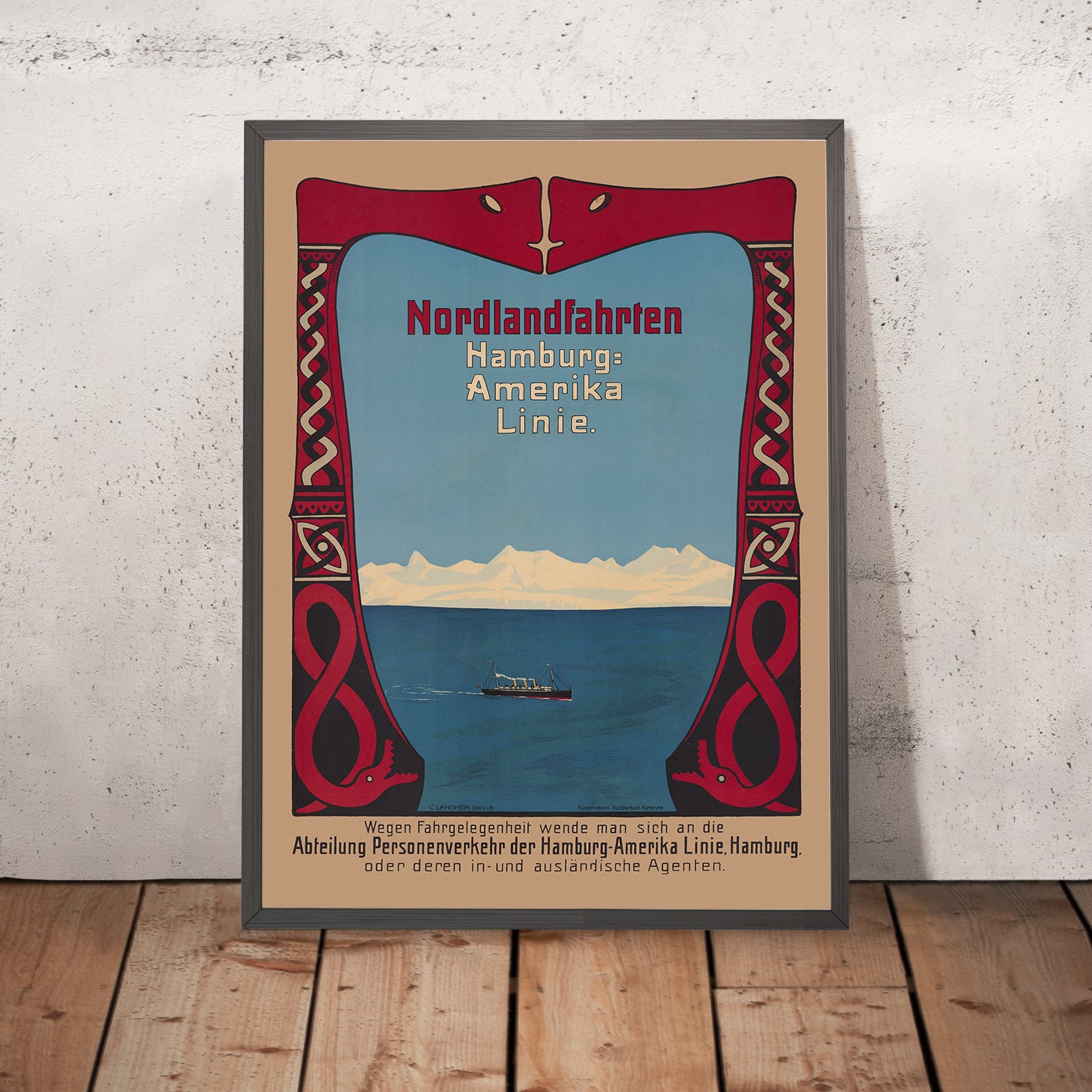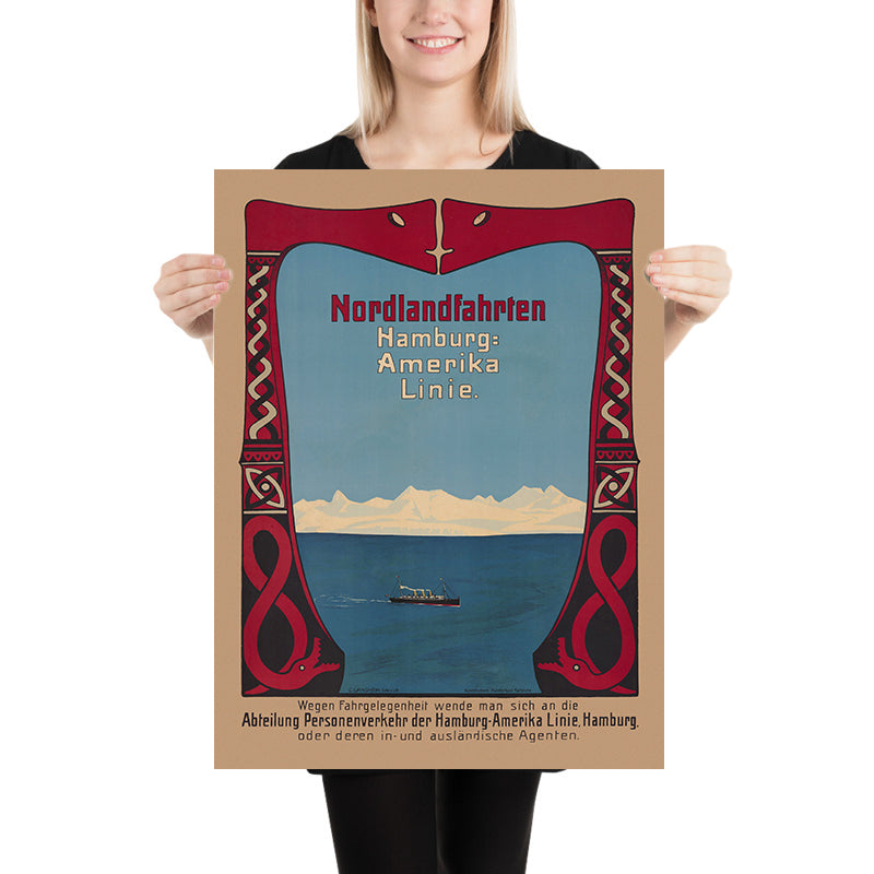 The subject here is especially compelling for lovers of Scandinavia and the North Atlantic. “Nordlandfahrten” tours promised sweeping Norwegian fjords, glacial light, and the exhilaration of long summer days near the Arctic Circle. By linking Hamburg with the “Nordland” coasts, the Hamburg-Amerika Linie helped popularize leisure cruising, reflecting a moment when exploration and modern comfort converged. The poster’s German wording—Nordlandfahrten and Hamburg-Amerika Linie (often abbreviated HAPAG)—anchors it in that history and makes it a conversation piece for travelers who have sailed the fjords or stood at the North Cape.