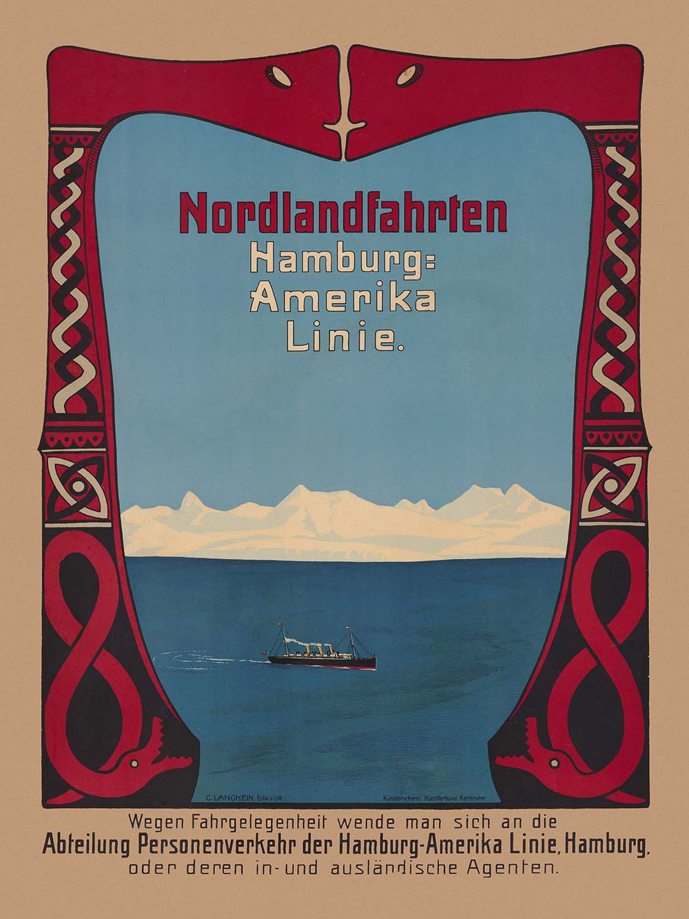 Nordlandfahrten; Hamburg-Amerika Linie by Carl Langhein captures the romance of early 20th‑century cruising from Hamburg to the far North. Rendered in a refined Art Nouveau hand, the poster spotlights a stately ocean liner gliding past snow-tipped peaks and deep northern waters, its bold typography inviting travellers to the “Nordlandfahrten”—voyages to the Nordic coasts and fjords. Langhein, a German painter and poster artist active in Hamburg’s vibrant port city, was known for crisp, modern silhouettes and elegantly balanced compositions that elevated commercial art into something collectible and timeless.