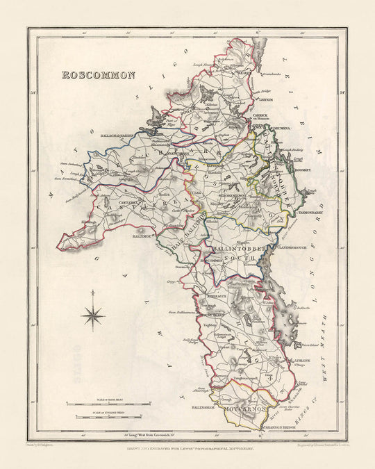Diese Karte ist ein Zeugnis der Kunstfertigkeit ihrer Zeit und zeigt handkolorierte Umrisse, die ihre visuelle Anziehungskraft erhöhen. Die Einbeziehung einer Kompassrose, die mit dem Norden nach oben links ausgerichtet ist, verleiht diesem Stück einen klassischen navigationalen Touch, sodass es nicht nur eine Karte, sondern ein Navigationswerkzeug aus einer vergangenen Ära ist. Jedes Baronat ist deutlich umreißt, was einen klaren Blick auf die politischen Grenzen bietet, die die Landschaft des County Roscommon im mittleren 19. Jahrhundert definierten.