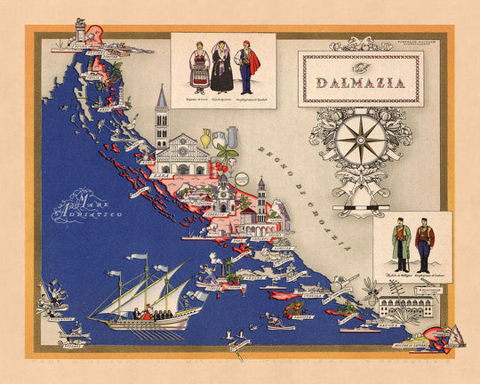 Diese Karte ist eine wertvolle Ressource für jeden, der sich für die Geschichte und Geographie Dalmatien interessiert. Es ist ein schönes und informatives Kunstwerk, das eine großartige Ergänzung für jede Sammlung darstellen würde.