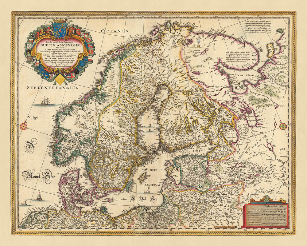 Diese atemberaubende Karte trägt den Titel „Tabula Exactissima Regnorum Sueciae et Norvegiae, nec non Maris Universi Orientalis Terrarumque angrenzendium“. Summo studio ab Andrea Bureo Sueco in lucem edita ... Ein „Nicolao Iohannide Piscatore“ wurde 1690 von Nicolaes Visscher II. gefertigt. Visscher II. war der Enkel von Claes Janszoon Visscher, einem berühmten Kartographen während des Goldenen Zeitalters der Niederlande. Der Titel bedeutet „Eine sehr genaue Karte der Königreiche Schweden und Norwegen sowie des gesamten Ostseeraums und der angrenzenden Länder.“ Mit großer Sorgfalt ans Licht gebracht vom Schweden Andreas Bureus ... von Nicolaes Visscher‘.