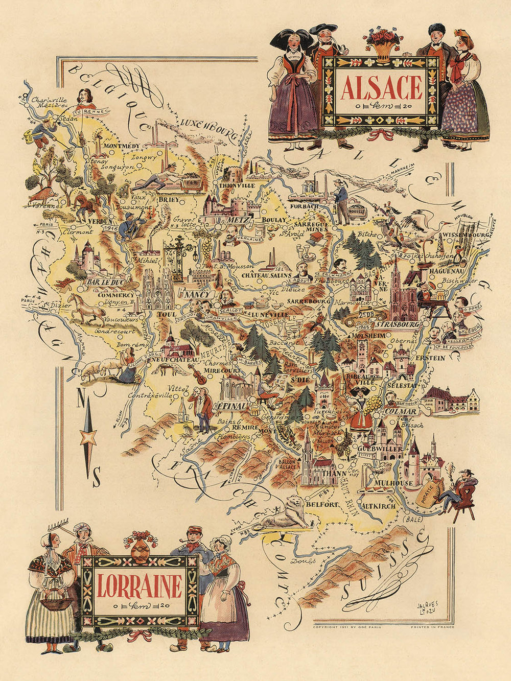 Die "Elsass und Lothringen"-Karte, die von dem angesehenen Kartografen Jacques Liozu im Jahr 1951 erstellt wurde, ist ein beeindruckendes Beispiel für die kartografische Kunst des mittleren 20. Jahrhunderts. Liozu, bekannt für seine detaillierten und kulturell reichen Karten, hat das Wesen dieser historisch bedeutenden Regionen meisterhaft eingefangen. Diese Karte ist nicht nur eine geografische Darstellung, sondern ein lebendiges Gewebe, das die kulturellen, historischen und natürlichen Elemente von Elsass und Lothringen miteinander verknüpft. Jede Illustration ist sorgfältig gezeichnet und erweckt das reiche Erbe und die vielfältigen Landschaften dieser französischen Regionen zum Leben.