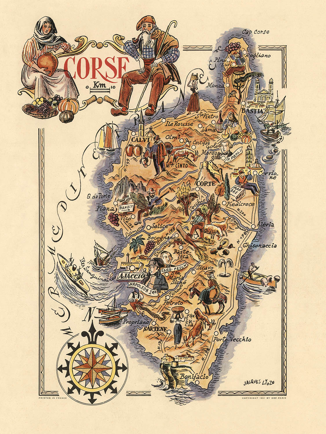 Alter bildlicher Karte von Korsika von Liozu, 1951: Ajaccio, Corte, Bastia, Napoleon, Berge