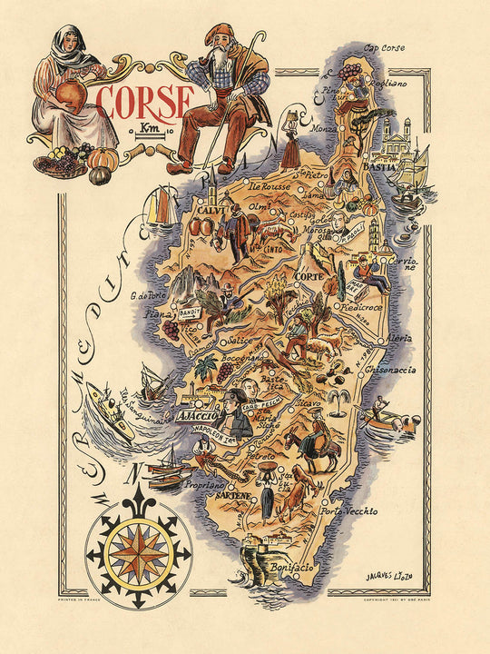 Die Karte ist mit einer dekorativen Windrose verziert und enthält zahlreiche Abbildungen, die das traditionelle Leben auf Korsika zeigen. Von der Darstellung der lokalen Landwirtschaft, wie Weinreben und Obstkörben, bis hin zur traditionellen Kleidung der Einwohner ist jedes Element sorgfältig wiedergegeben. Die Karte enthält auch maritime Elemente, darunter Boote und Schiffe, die Korsikas starke Verbindung zum Meer hervorheben. Das künstlerische Randdesign erhöht die ästhetische Anziehungskraft der Karte zusätzlich und macht sie zu einem faszinierenden Stück für jeden Sammler.