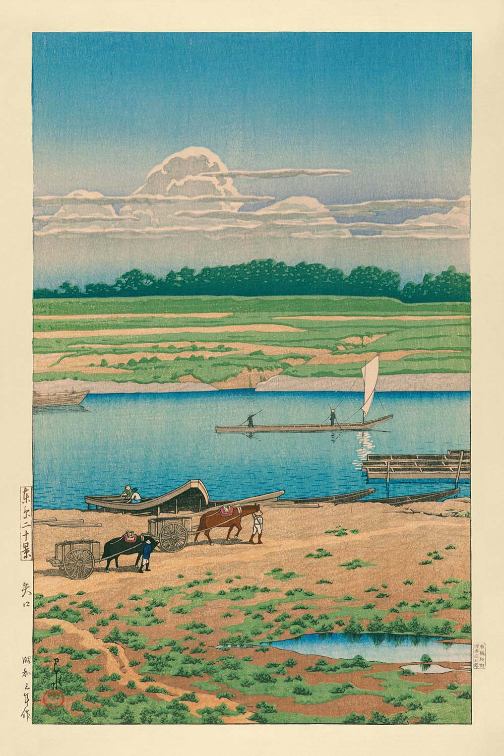 Geboren in Tokio in den 1880er Jahren, wurde Hasui Kawase für seine Landschaftsdrucke und modernen Interpretationen traditioneller japanischer Ukiyo-e-Techniken bekannt. Seine akribische Kunstfertigkeit und emotionale Tiefe bei der Darstellung saisonaler Übergänge und ländlicher Vignetten brachten ihm internationale Anerkennung. "River Sailboat and Horses" hebt sich durch seine meisterhafte Gegenüberstellung von ruhigen natürlichen Umgebungen und menschlichen Engagements ab, ein Markenzeichen von Kawases Portfolio.
