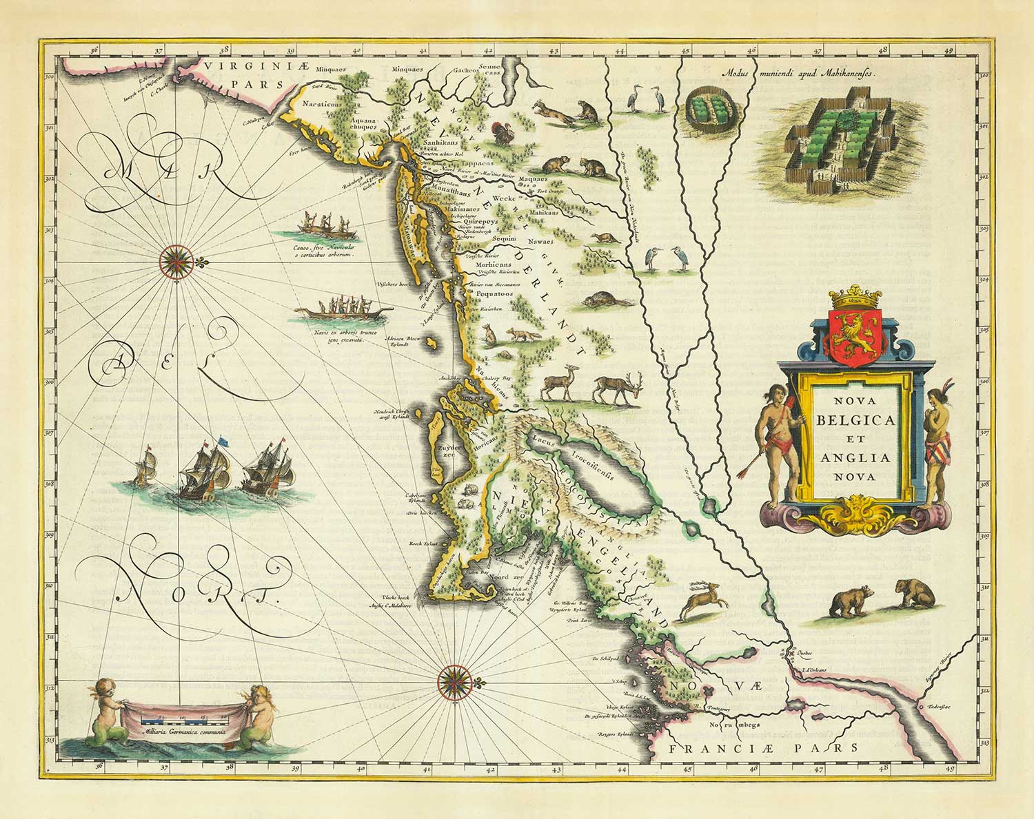 Alte Karte von Neuen Niederlanden und Neuengland im Jahr 1640 von Willem Blaeu: Manhattan, Providence, New York, Boston, New Jersey