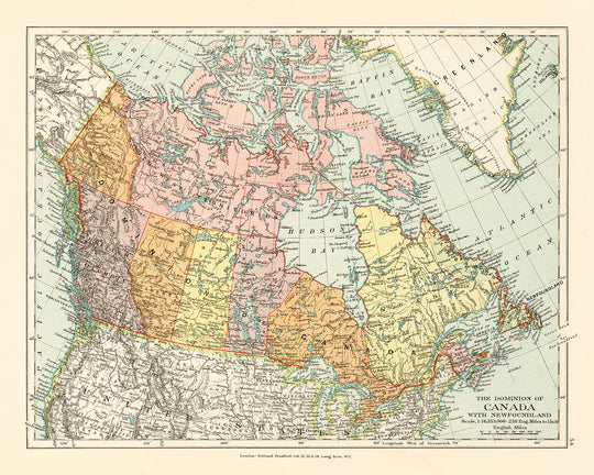 Diese Karte ist nicht nur eine Darstellung politischer Grenzen; sie ist ein Fenster in das geografische und kulturelle Gefüge von Kanada und Neufundland. Die Karte umreißt elegant die Provinzen, geschmückt mit Eisenbahnen und Entwässerungssystemen, die die Geschichte einer Nation in Bewegung erzählen. Gewässer wie die Hudsonbucht und der Atlantische Ozean sind wunderschön dargestellt und vermitteln ein Gefühl für die umfangreichen natürlichen Ressourcen, die die Geschichte der Region geprägt haben. Die Einbeziehung von Längen- und Breitengraden sowie einer Maßstabsleiste in englischen Meilen gewährleistet eine präzise geografische Orientierung und macht sie sowohl zu einem funktionalen als auch zu einem dekorativen Stück.
