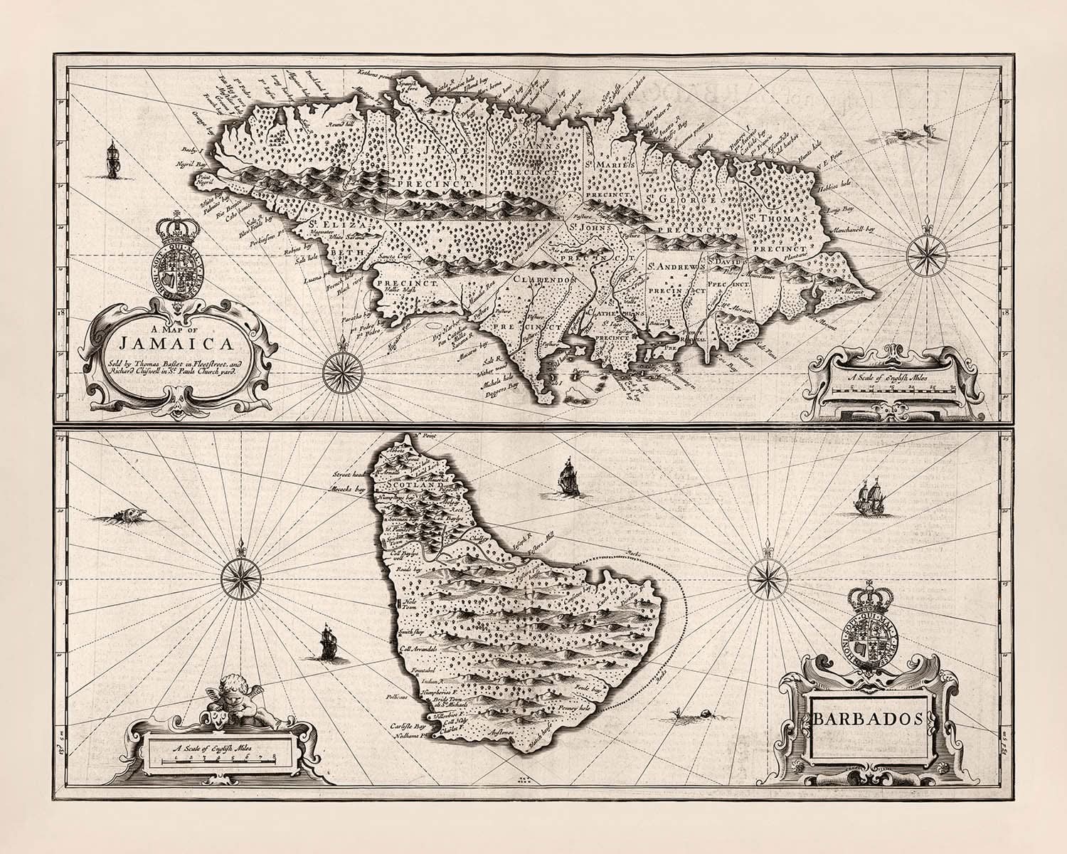 Alte Karte von Jamaika und Barbados von Speed, 1676: Port Royal, Bridgetown, Berge, Schiffe