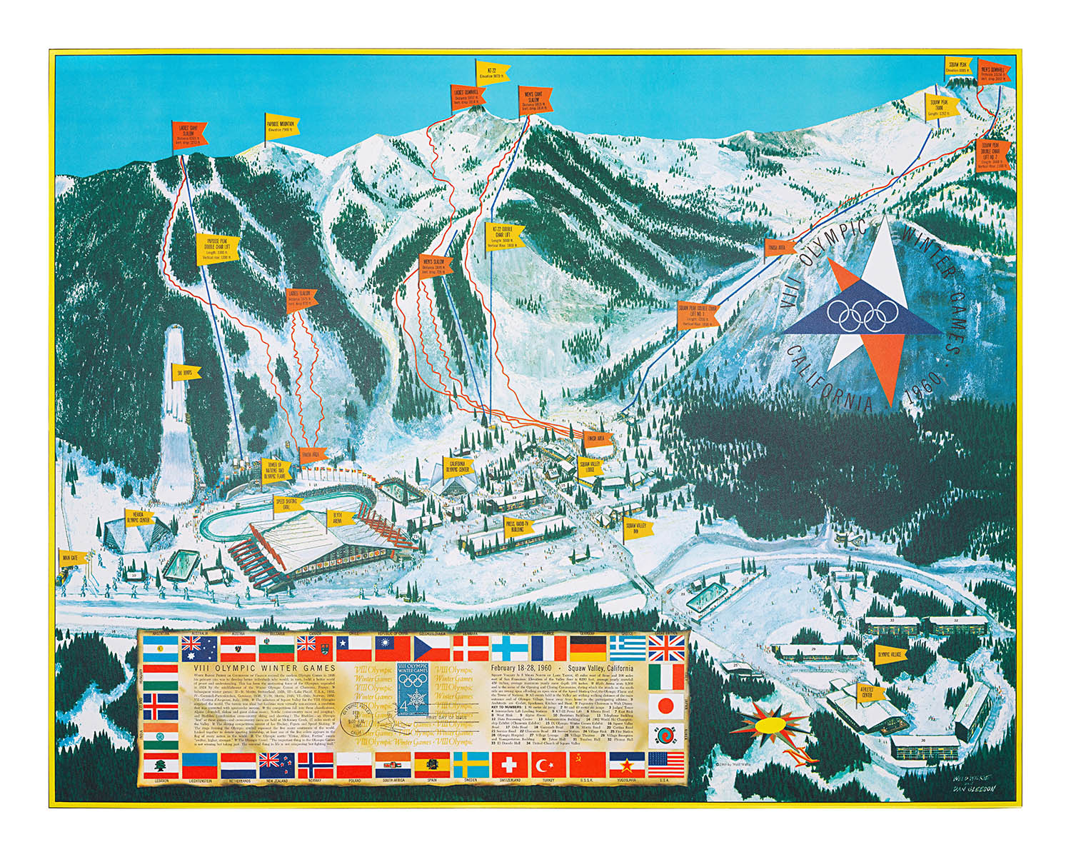 Rare and radiant, Weld Wilkie’s VIII Winter Olympic Games California 1960 is a celebratory pictorial map of Squaw Valley at the instant it became the world’s winter-sport capital. In bright, confident color, Wilkie renders the valley and surrounding Sierra crest as a lively amphitheater, with Squaw Peak and the Men’s Downhill start commanding the top left. The main ice rink and outdoor speed-skating venue anchor the valley floor, while ski jumping, slalom, and downhill courses sweep toward well-marked viewing areas. National flags punctuate the margins, proclaiming global presence, and a thematic cartouche frames the ideals of the Games. More than an orientation, this map captures the choreography of venues, roads, lifts, and lodges that transformed Lake Tahoe’s high country into an Olympic stage.